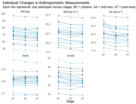 At prerace, four male ultrarunners presented with BMI ≥ 25 kg·m−2; in one of these, WHR exceeded 0.90 and WHtR exceeded 0.50. After Stage 4, three athletes still exhibited BMI ≥ 25 kg·m−2, with one maintaining WHR > 0.90 and a DE of 56.9 mm. By post-race (after Stage 7), BMI ≥ 25 kg·m−2 persisted in two runners. Individual trajectories are illustrated in Figure 2.