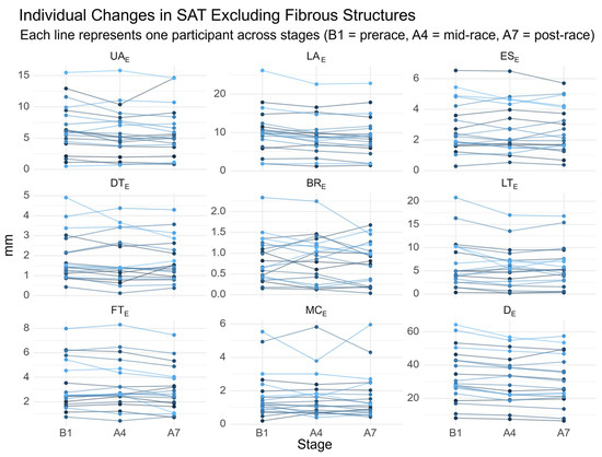 In these athletes, the corresponding sums of SAT excluding embedded fibrous structures (DE) ranged from 34.6 to 64.4 mm. After Stage 7, DE values ranged from 31.4 to 49.6 mm. A WHR > 0.90 was again observed in one runner, accompanied by a DE of 53.6 mm. Individual SAT trajectories are presented in Figure 3.