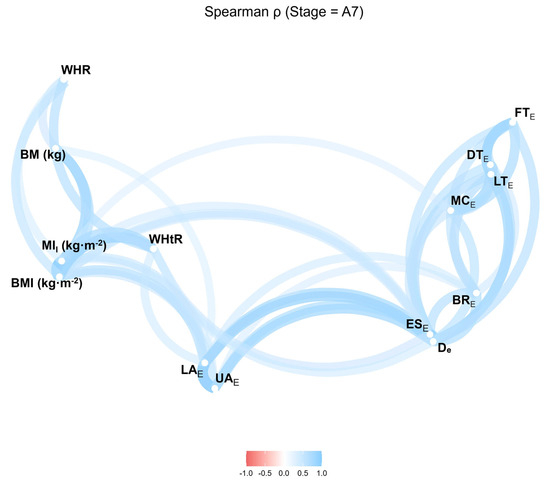 Correlation network of anthropometric indices and SAT thicknesses excluding fibrous structures after Stage 7. BMI, body mass index; MII, improved mass index; WHR, waist-to-hip ratio; WHtR, waist-to-height ratio; UA, upper abdomen; LA, lower abdomen; ES, erector spinae; DT, distal triceps; BR, brachioradialis; LT, lateral thigh; FT, front thigh; MC, medial calf. Values range from −1.0 to 1.0 (Spearman’s r).