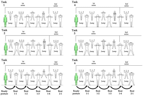 The task used in this study was the rhythmic jumping task (RJT), which was developed and validated in the previous study [11]. This task requires coordinated movement of the upper and lower limbs. All motions were restricted to the frontal plane and performed using laterally symmetrical movement patterns, allowing the RJT to evaluate upper–lower limb coordination under standardized, simplified conditions. The participants performed light, continuous jumps in synchrony with a metronome beat, coordinating both upper- and lower-limb movements. Six tasks identical to those employed in the previous study were administered. The metronome tempo was set at 120 beats per minute (bpm), as in the previous study. This tempo range (100–120 bpm) has been reported to represent a natural and stable rhythm for performing rhythmic movements in both adults and high-school students [11,16]. The posture assumed at the moment of each metronome beat was defined as “posture,” and the arm and leg movements executed between beats were described as “motion.” Four motions constituted one series, and four consecutive series comprised one task. To address the reviewers’ request for a complete description of all six tasks, Figure 1 illustrate the representative motion sequences for Tasks 1 to 6. This illustration were created based on the movement definitions established in the previous study [11]. As shown in the figure, the upper-limb movement pattern was identical across all tasks. Participants began with their arms resting naturally at their sides. In synchrony with the metronome beat, both hands moved upward toward the center above the head and reached the top position exactly on the beat. The hands then moved downward toward the shoulders, making contact with the ipsilateral shoulder on the second beat. The hands remained on the same-side shoulders until the third beat. Finally, both hands moved rapidly to the contralateral shoulders and returned to the ipsilateral shoulders on the fourth beat, completing one series of upper-limb movements. Without returning to the ready posture, the hands immediately moved upward again to initiate the next series.