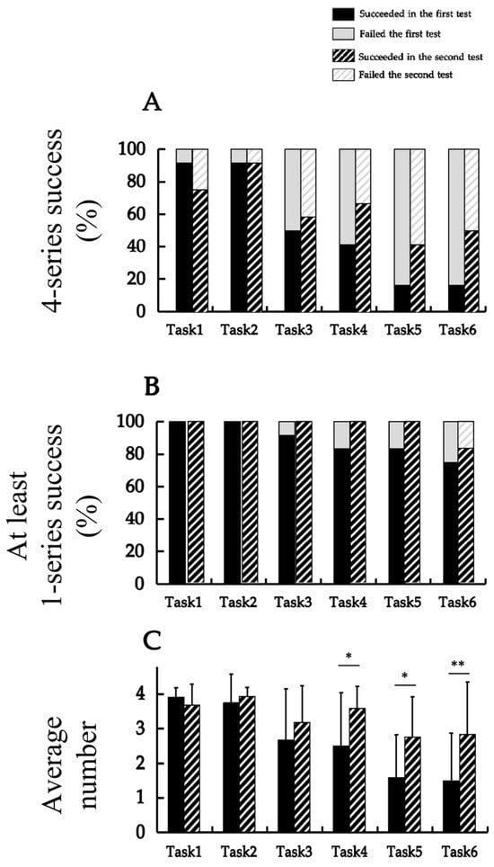 Comparison of the successful completion of the six tasks. (A) The percentage of success with four series; (B) the percentage of success with at least one series; and (C) the average number of successful series. Results of (A,B) and (C) were analyzed using Cochran’s Q test and the paired t-test, respectively. Black areas represent successful performance and grey areas represent unsuccessful performance. The significant differences are presented in the form of “a”, “b”, “c”, and “d”. The value indicated by “a” is significantly higher than those indicated by “b”, “c”, and “d”. The value indicated by “b” is significantly higher than those indicated by “c” and “d”. The value represented by “c” is significantly higher than that indicated by “d”. The values indicated by the same letters, such as “a, b” or “b, c”, indicate that no significant difference was detected between the corresponding groups (p < 0.05).