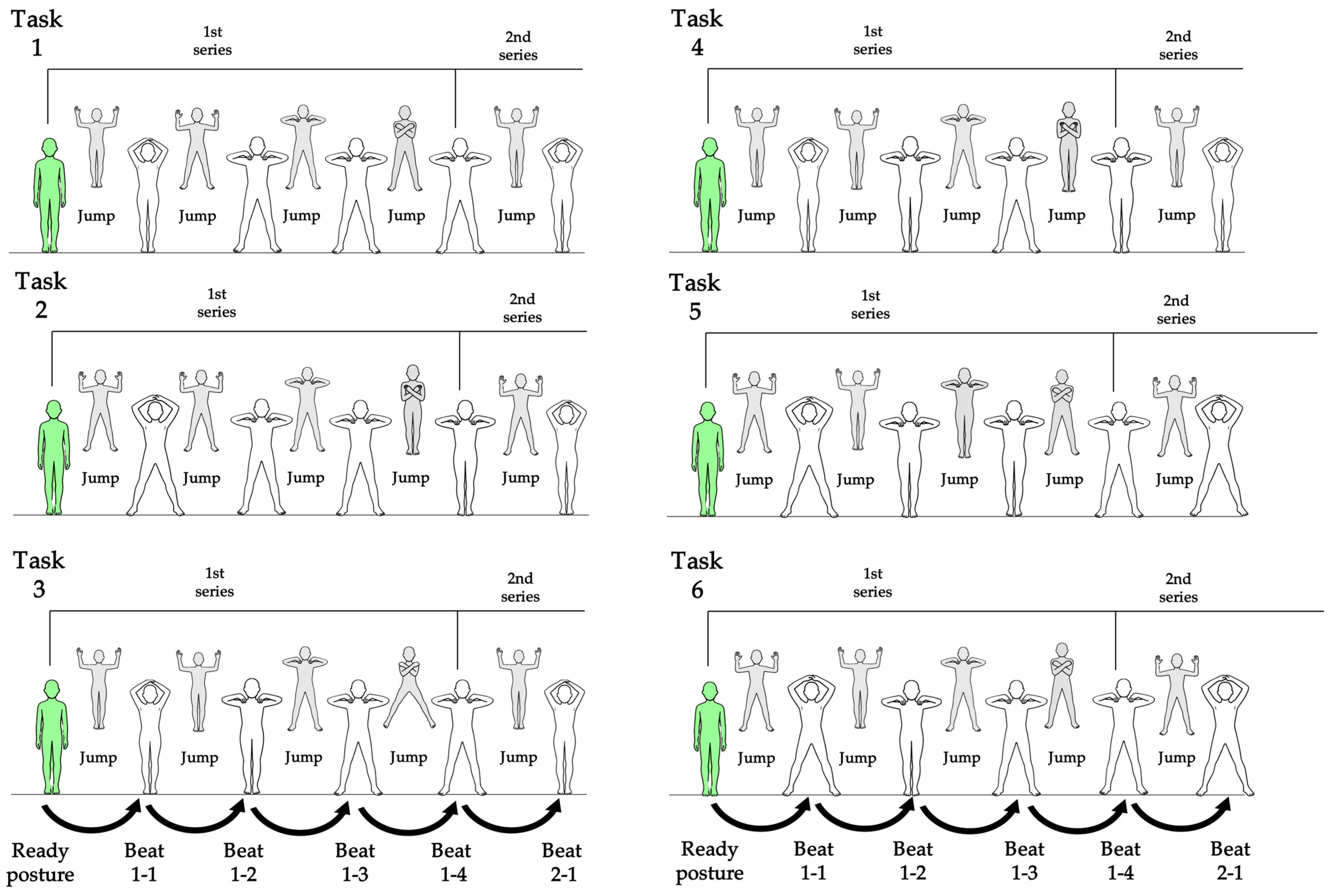 The task used in this study was the rhythmic jumping task (RJT), which was developed and validated in the previous study [11]. This task requires coordinated movement of the upper and lower limbs. All motions were restricted to the frontal plane and performed using laterally symmetrical movement patterns, allowing the RJT to evaluate upper–lower limb coordination under standardized, simplified conditions. The participants performed light, continuous jumps in synchrony with a metronome beat, coordinating both upper- and lower-limb movements. Six tasks identical to those employed in the previous study were administered. The metronome tempo was set at 120 beats per minute (bpm), as in the previous study. This tempo range (100–120 bpm) has been reported to represent a natural and stable rhythm for performing rhythmic movements in both adults and high-school students [11,16]. The posture assumed at the moment of each metronome beat was defined as “posture,” and the arm and leg movements executed between beats were described as “motion.” Four motions constituted one series, and four consecutive series comprised one task. To address the reviewers’ request for a complete description of all six tasks, Figure 1 illustrate the representative motion sequences for Tasks 1 to 6. This illustration were created based on the movement definitions established in the previous study [11]. As shown in the figure, the upper-limb movement pattern was identical across all tasks. Participants began with their arms resting naturally at their sides. In synchrony with the metronome beat, both hands moved upward toward the center above the head and reached the top position exactly on the beat. The hands then moved downward toward the shoulders, making contact with the ipsilateral shoulder on the second beat. The hands remained on the same-side shoulders until the third beat. Finally, both hands moved rapidly to the contralateral shoulders and returned to the ipsilateral shoulders on the fourth beat, completing one series of upper-limb movements. Without returning to the ready posture, the hands immediately moved upward again to initiate the next series.