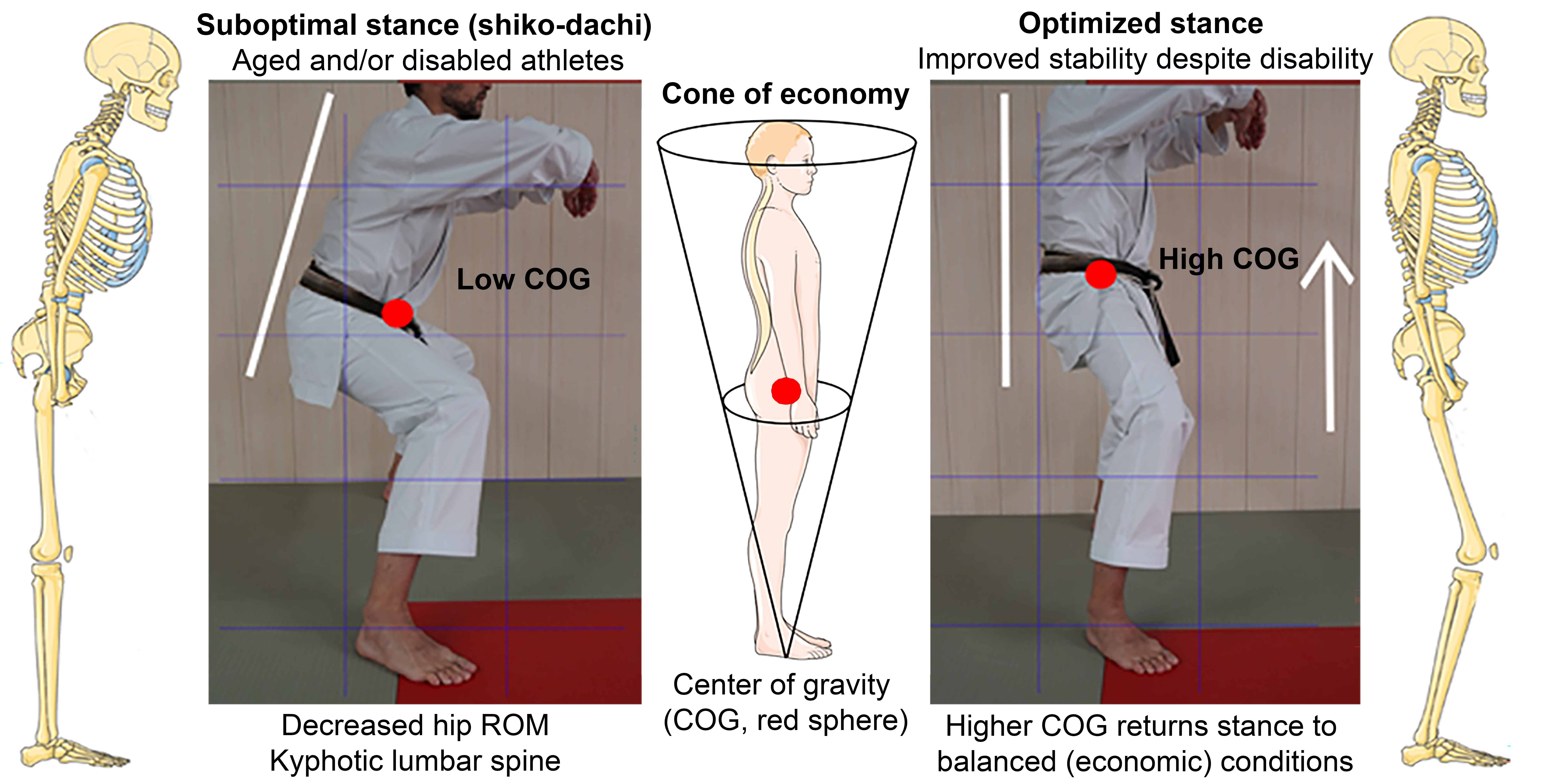 | Stability and balance | Knee flexion lowers the COG and enhances stability. In Zenkutsu- or Shiko-dachi, bending the knees provides a solid base for maintaining balance during movements including the effective execution of blocks and strikes. Straight legs or a reduced ROM reduce the necessary stability and can compromise the ability to react appropriately. |