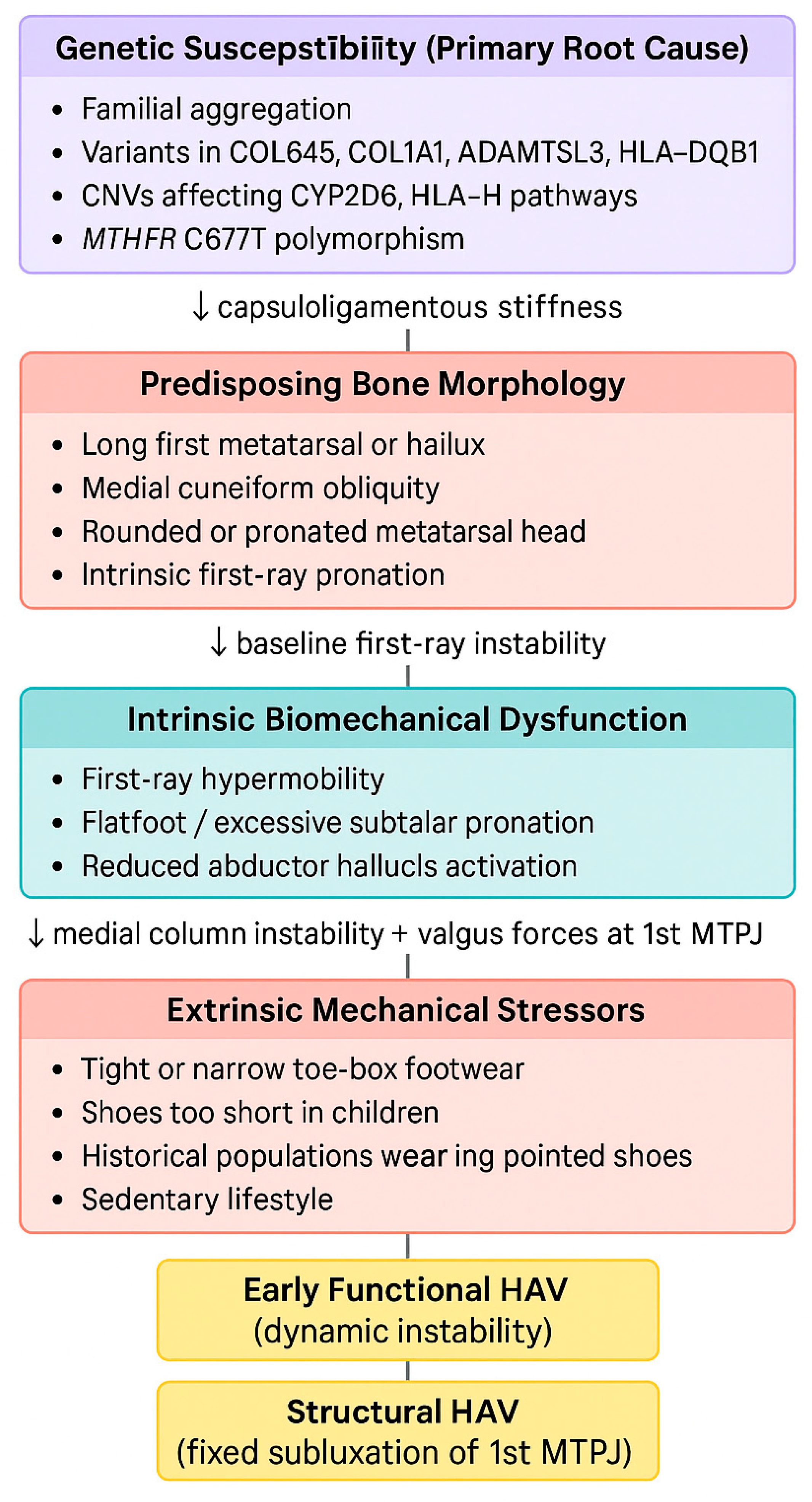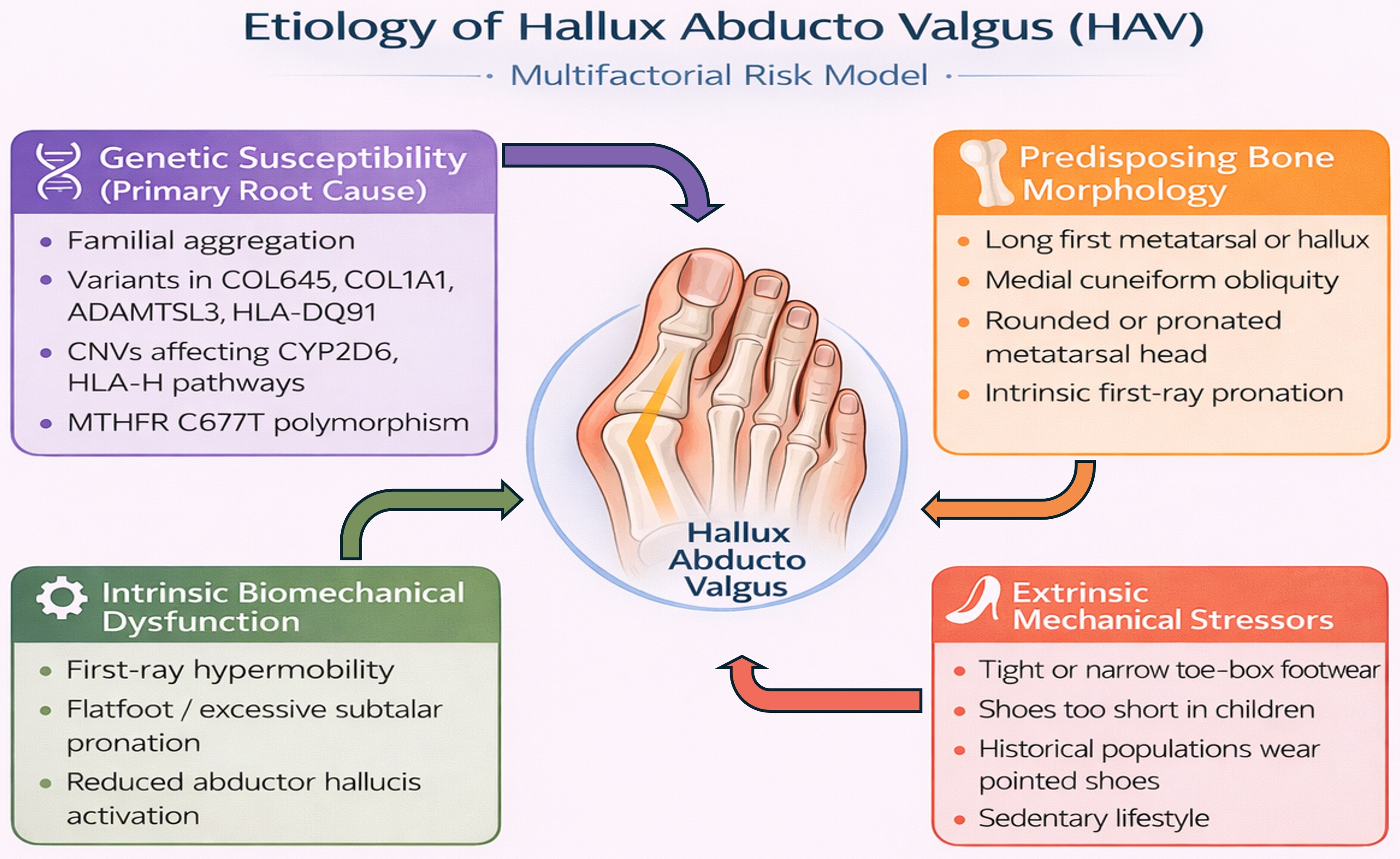 | Mancuso et al. [48] (2003). Case–control study. USA. | 3b | To examine MT1 length, metatarsal head shape, IMA, and HAV development. | 210 adults | F = 173 M = 37 42.1 ± 15.42 years. 110 HAV, 100 controls). | MT1 length, protrusion distance, head shape. | Weightbearing radiographs; morphological classification. | HAV was associated with long MT1 and round head; MT1 length correlated with severity. | Long MT1 is a clear risk factor for HAV. |