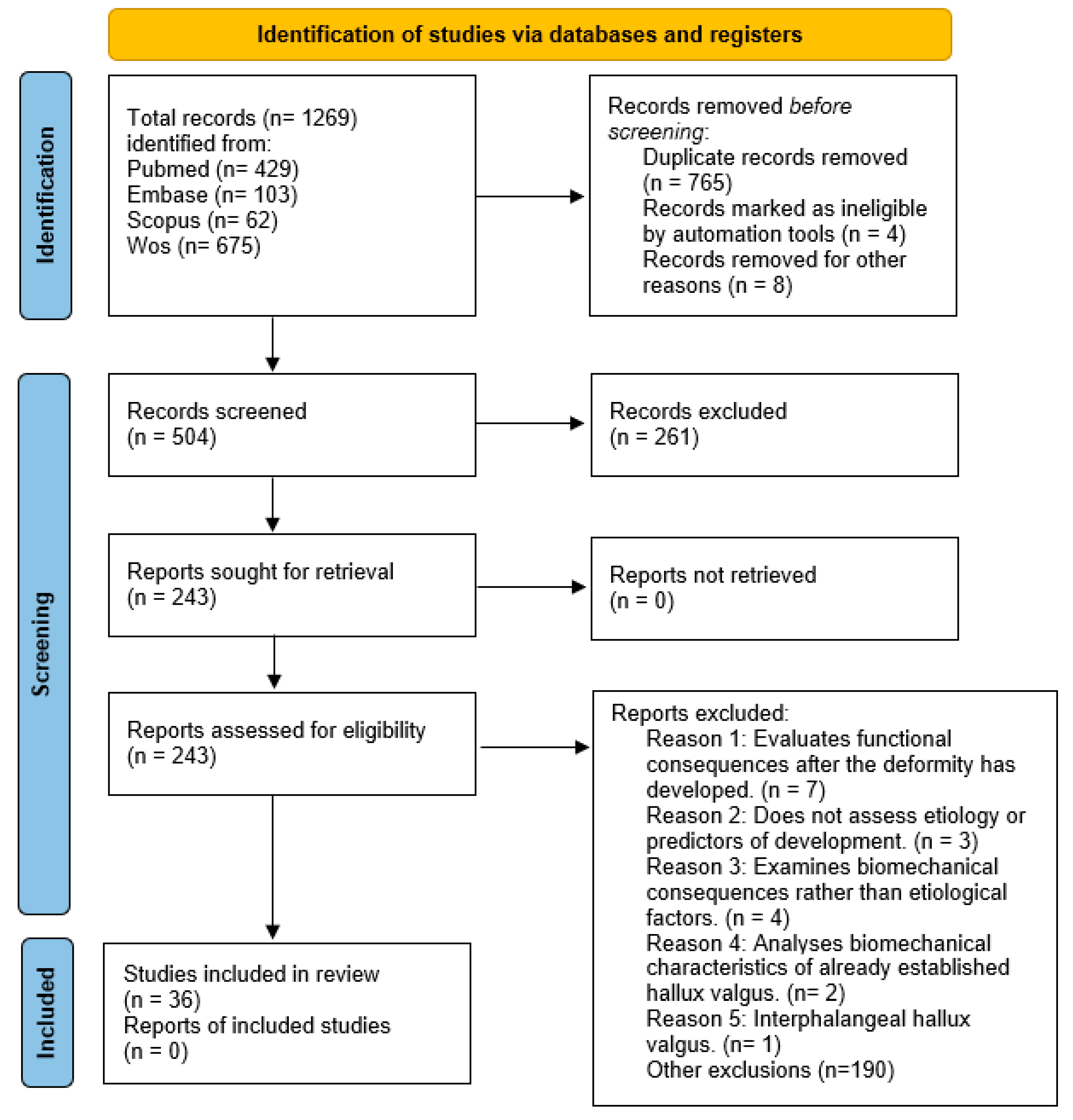 | All databases | (hallux valgus OR hallux abductovalgus) NOT (hallux limitus OR hallux rigidus OR hallux varus) AND (etiolog OR aetiology OR risk factors OR factor OR caus* OR pathogenesis OR genetics OR congenital OR famil* OR hered* OR inherit* OR hormonal OR relaxin OR shoe* OR shoewear OR footwear OR osteoarthritis OR arthritis OR rheumat* OR hipermobility OR first ray OR first metatarsal head OR peroneus longus OR intrinsic musculature OR extrinsic musculature OR biomechanics) NOT (surgery OR osteotomy OR treatment OR therap*). |