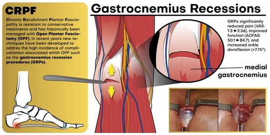 - Gamba, C.; Serrano-Chinchilla, P.; Ares-Vidal, J.; Solano-Lopez, A.; Gonzalez-Lucena, G.; Ginés-Cespedosa, A. Proximal Medial Gastrocnemius Release Versus Open Plantar Fasciotomy for the Surgical Treatment in Recalcitrant Plantar Fasciitis. Foot Ankle Int. 2020, 41, 267–274. [Google Scholar] [CrossRef]