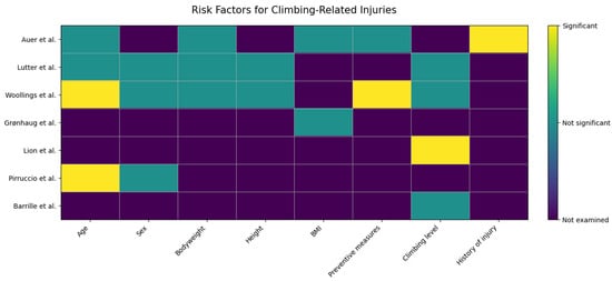 - Kovářová, M.; Pyszko, P.; Kikalová, K. Analyzing Injury Patterns in Climbing: A Comprehensive Study of Risk Factors. Sports 2024, 12, 61. [Google Scholar] [CrossRef]