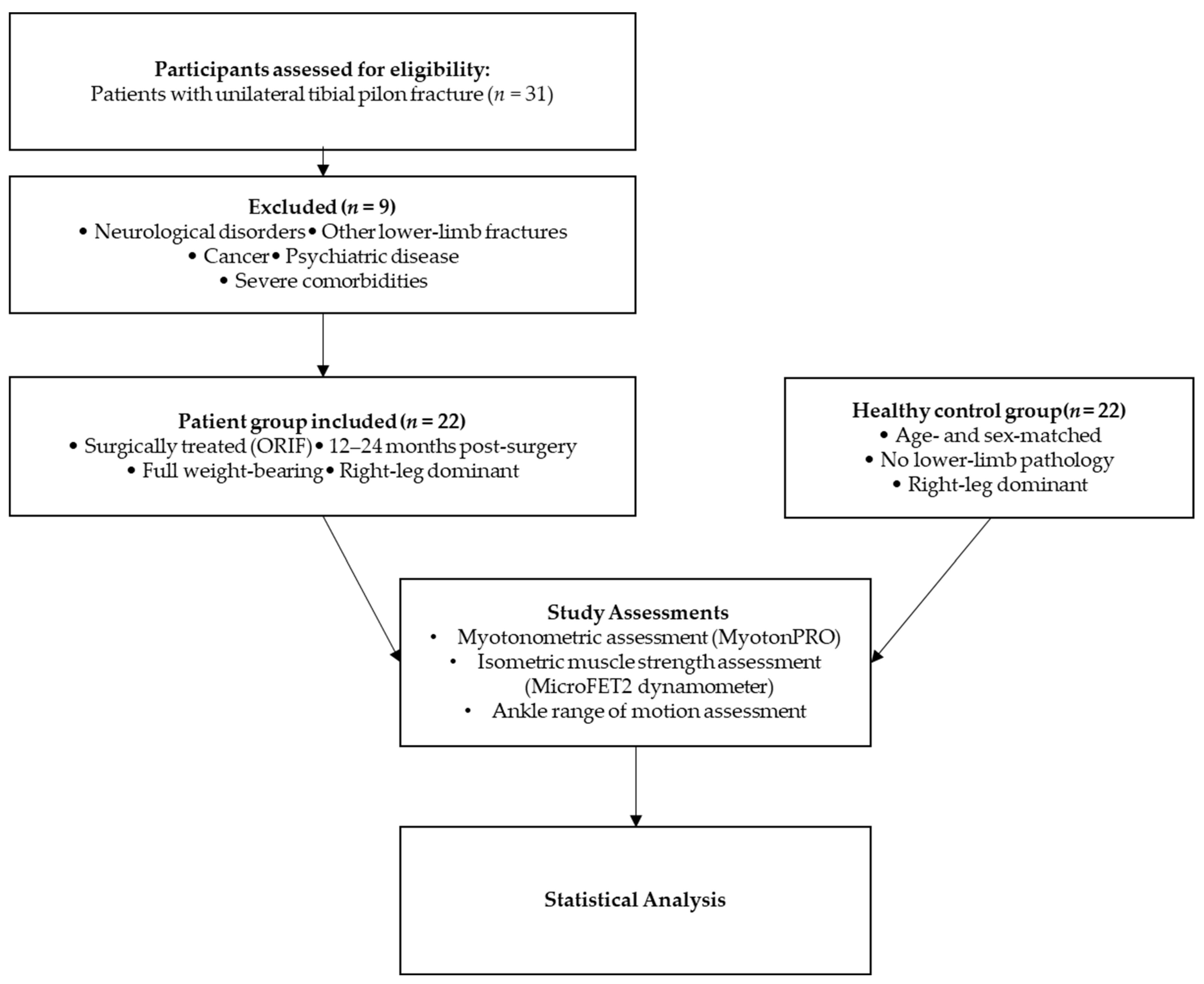 APA StyleBolovan, A.-D., Hogea, G.-B., Amaricai, E.-C., Tapardea, A.-R., Abu-Awwad, A., & Catan, L. (2026). Myotonometry and Muscle Force in Patients with Surgically Treated Tibial Pilon Fracture: A Cross-Sectional Study. Journal of Functional Morphology and Kinesiology, 11(1), 21. https://doi.org/10.3390/jfmk11010021