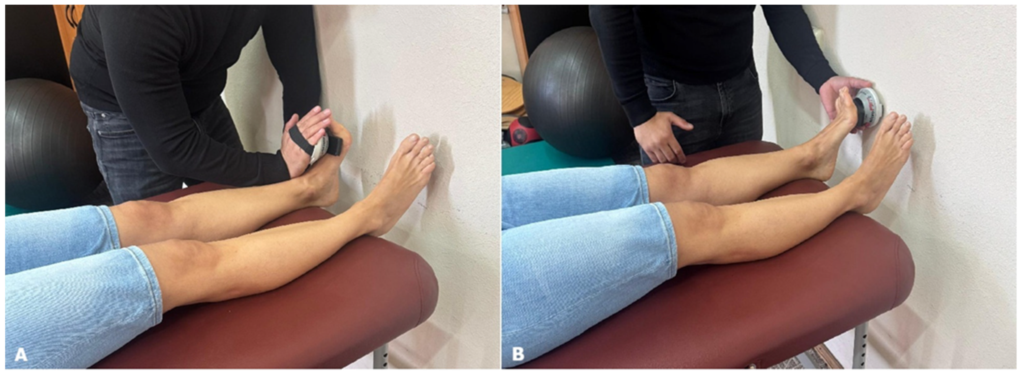 - Davis, P.R.; McKay, M.J.; Baldwin, J.N.; Burns, J.; Pareyson, D.; Rose, K.J. Repeatability, Consistency, and Accuracy of Hand-Held Dynamometry with and without Fixation for Measuring Ankle Plantarflexion Strength in Healthy Adolescents and Adults. Muscle Nerve 2017, 56, 896–900. [Google Scholar] [CrossRef]