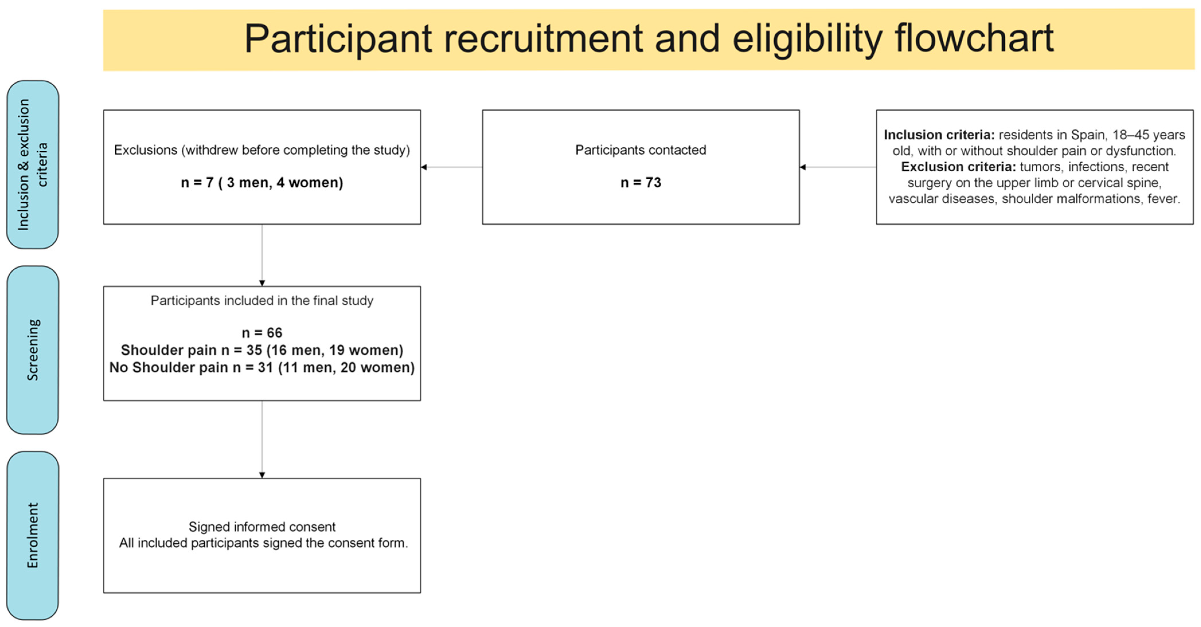 The original cohort included 66 participants recruited between April and December 2022 through healthcare professionals at Viamed Santa Elena Hospital and faculty members from the Universidad Complutense de Madrid. Inclusion criteria were (1) age between 18 and 45 years, (2) residents of Spain, and (3) either asymptomatic or presenting shoulder pain/structural alteration detectable by ultrasound (e.g., tendinopathy, bursitis, partial tear). Exclusion criteria included tumors, infections, recent upper limb or cervical spine surgery, vascular disease, congenital malformations, or fever at the time of evaluation [
