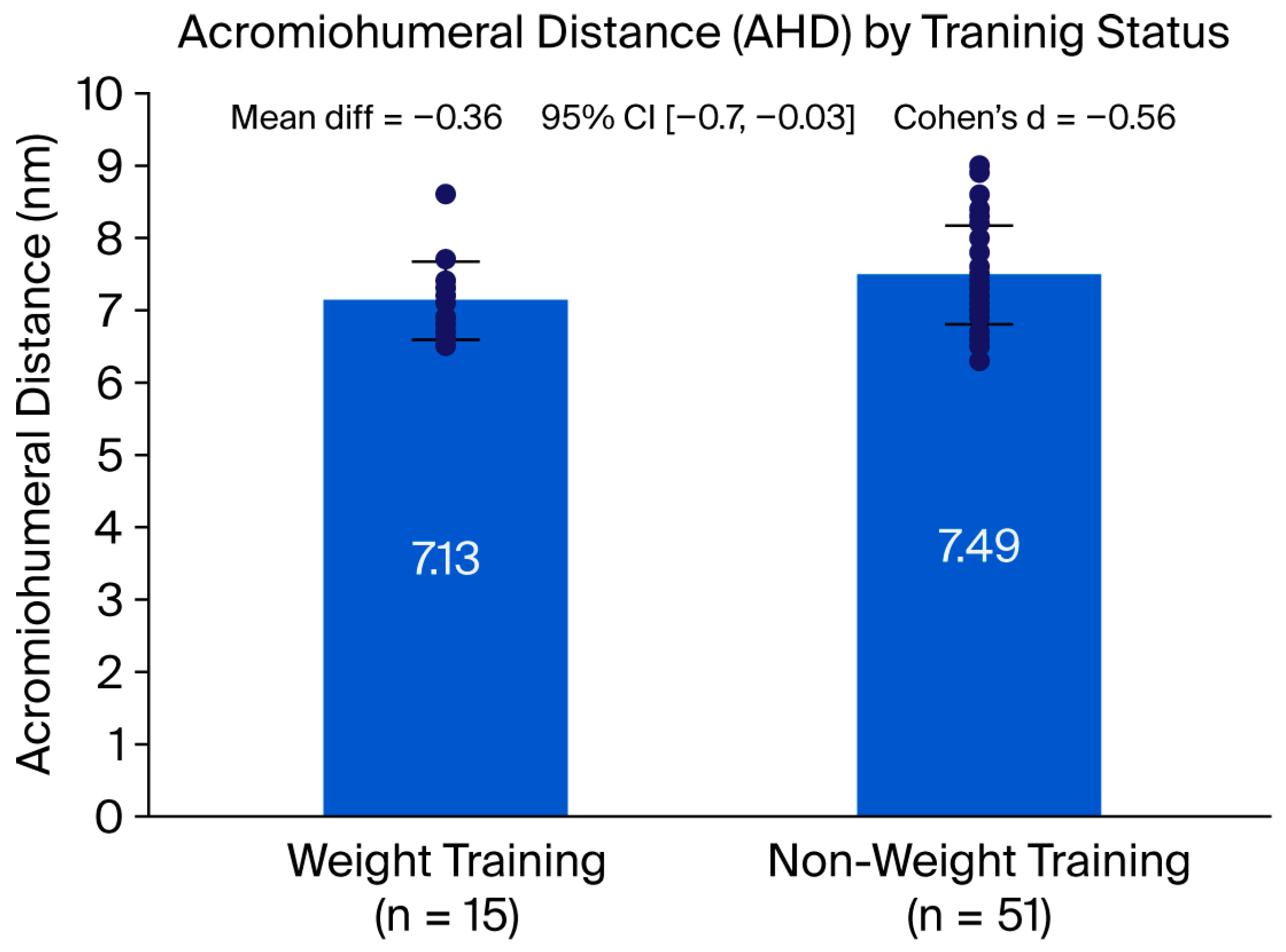 Although the between-group difference in acromiohumeral distance reached statistical significance, its magnitude (0.36 mm) did not exceed the previously reported minimum detectable change (MDC = 0.44 mm). This finding indicates that the observed difference may not be reliably detectable at the individual level and should therefore not be interpreted as a clinically meaningful change per se. Rather, it reflects a consistent group-level structural difference that may represent early or subclinical adaptations associated with upper-limb weight training. From a measurement perspective, this distinction underscores the importance of differentiating statistical significance from measurement sensitivity and clinical relevance when interpreting small changes in AHD.