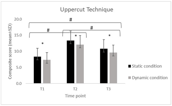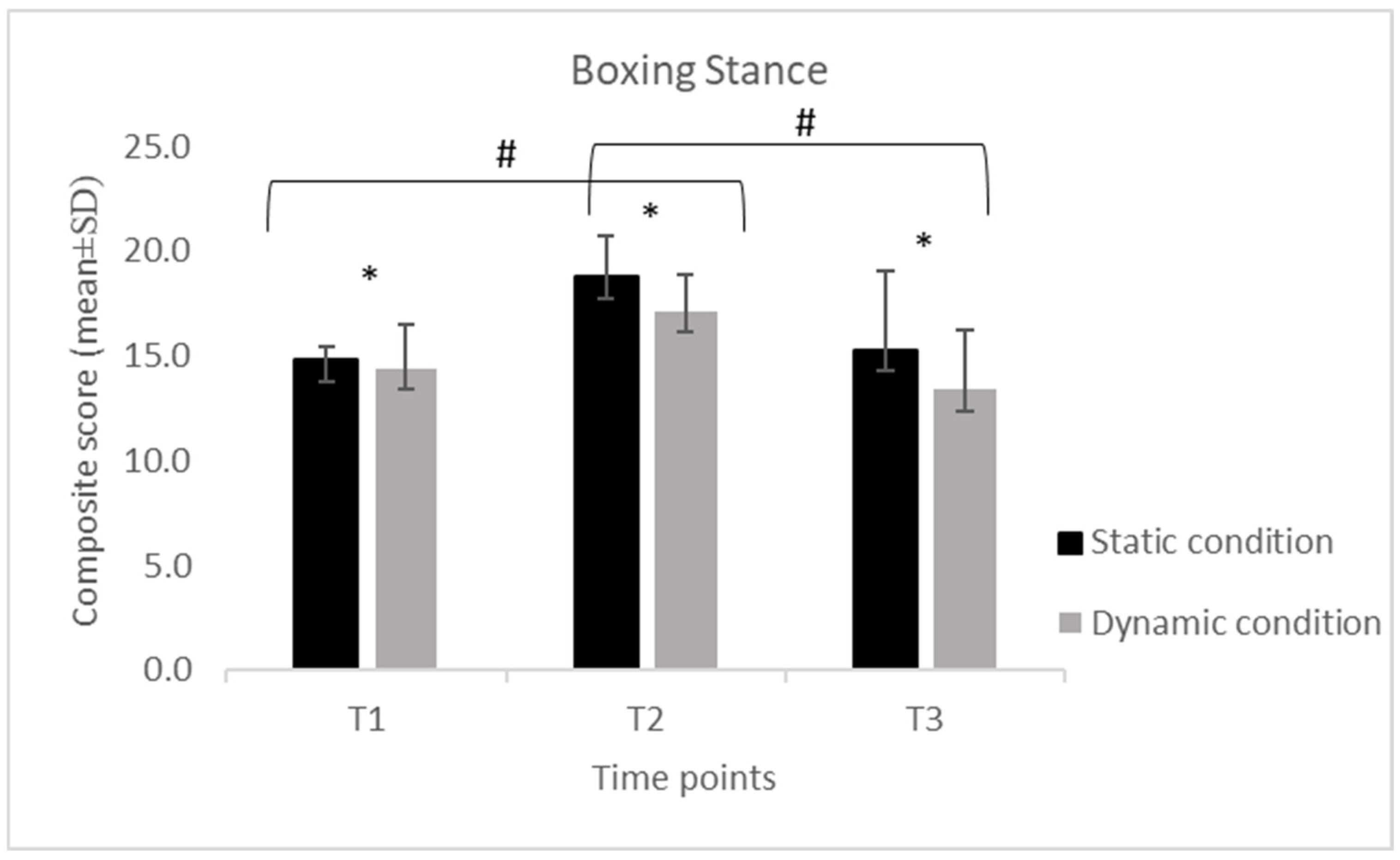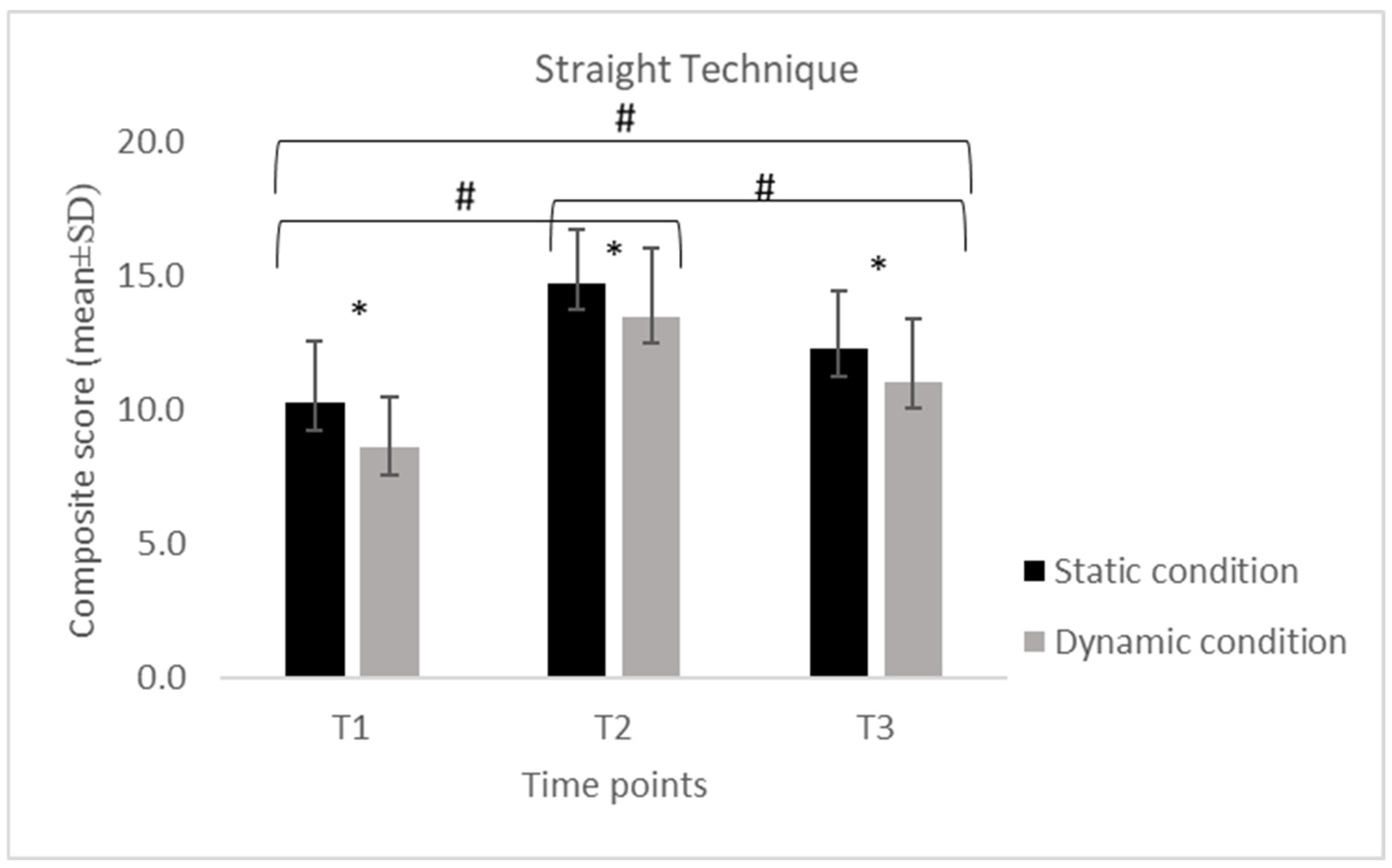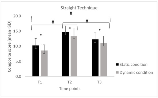 For the S, performance increased from T1 to T2 and decreased at T3 in both conditions. In the static condition, scores increased from 14.8 ± 0.63 at T1 to 18.7 ± 2.00 at T2 and decreased to 15.3 ± 3.77 at T3, while in the dynamic condition, values increased from 14.4 ± 2.11 to 17.1 ± 1.79 and decreased to 13.4 ± 2.81. For the SP, a similar temporal pattern was observed. Static performance increased from 10.3 ± 2.33 at T1 to 14.7 ± 2.00 at T2 and declined to 12.3 ± 2.18 at T3, while dynamic performance increased from 8.58 ± 1.89 to 13.5 ± 2.61 and decreased to 11.1 ± 2.32. For the H, static scores increased from 9.21 ± 2.74 at T1 to 13.8 ± 2.32 at T2 and decreased to 11.2 ± 2.64 at T3, whereas dynamic scores increased from 7.89 ± 2.03 to 12.3 ± 2.58 and declined to 9.95 ± 2.50. For the U, static scores increased from 8.37 ± 2.59 at T1 to 13.4 ± 2.99 at T2 and decreased to 10.8 ± 2.88 at T3. In the dynamic condition, scores increased from 7.32 ± 2.29 to 12.1 ± 2.83 and declined to 9.58 ± 2.34.