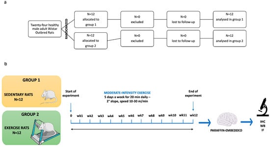 The twenty-four rats, identified only by unique ID numbers, were randomly assigned to experimental groups (n = 12 per group) using a computer-generated random sequence. Animals were allocated to either Group 1 (sedentary control) or Group 2 (12-week moderate physical exercise on a treadmill, as per Di Rosa et al. [40]). To ensure allocation concealment, the sequence was placed in sequentially numbered, opaque, sealed envelopes. A researcher generated the sequence, while another researcher, who was blinded to the group assignments, enrolled the animals and opened the envelopes only after baseline measurements were completed. To maintain blinding during the study, cages were labeled with neutral codes (Group A and Group B) by a technician not involved in the outcome assessment. All outcome assessors, laboratory analysts, and the statistician remained blinded to the identity of these codes. The key linking the neutral labels to the actual treatment groups was kept in a locked file and was only unblinded after the formal statistical analysis was completed. In the training protocol, the rats trained 5 days a week, 20 min per day on a treadmill (2Biological instrument, Varese, Italy), with a slope set to 2°, and the speed was gradually raised from 10 to 30 m/min in order to stimulate moderate intensity training (Figure 1). Animals unable to perform exercise would be excluded and replaced. In our case, no animals were excluded from the study, and the results included all variables analyzed.