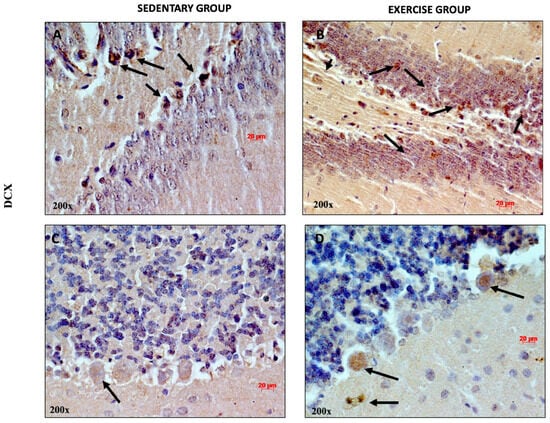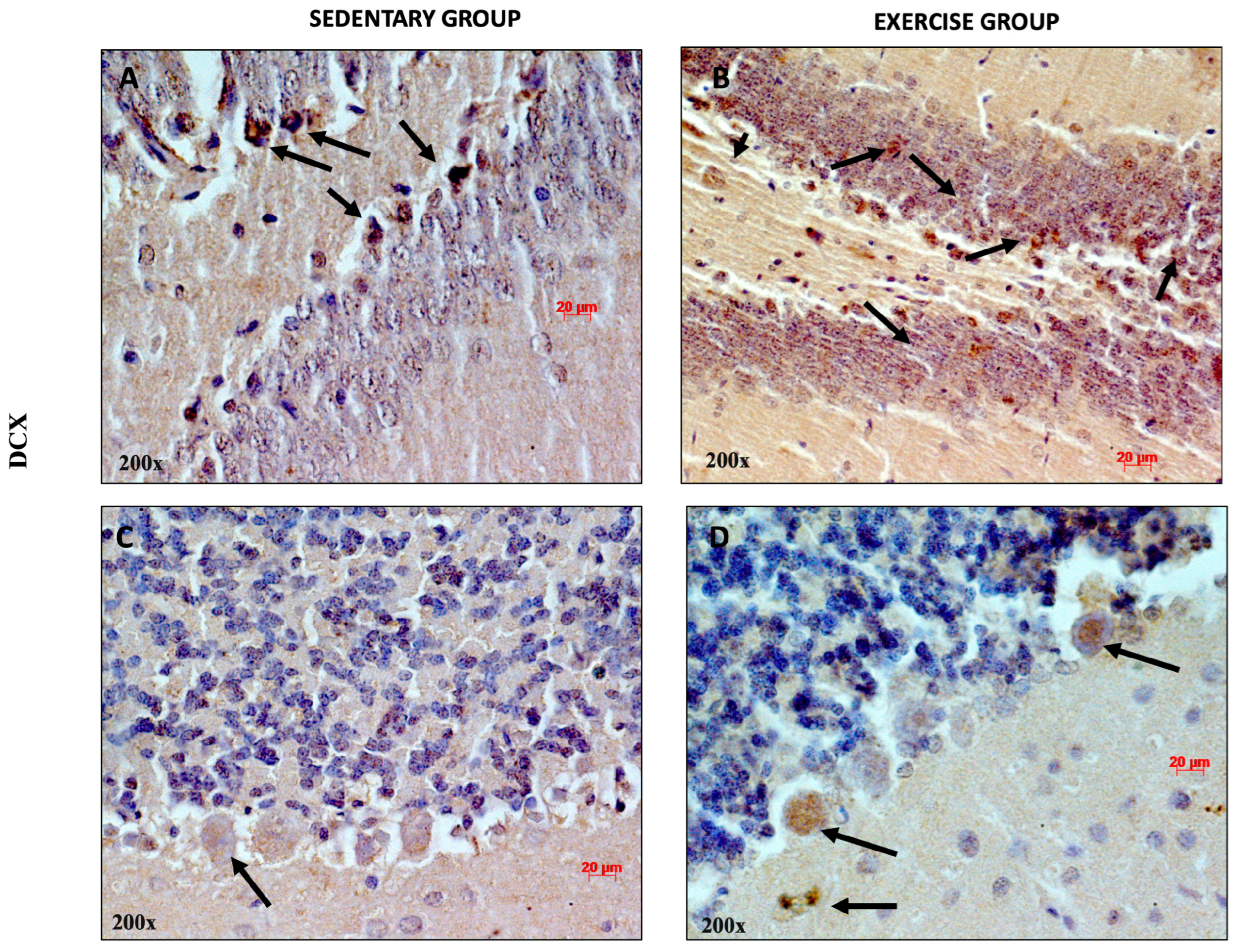 Figure 4. Representative immunohistochemical staining of DCX in DG (n = 12) (A,B) and cerebellum (n = 12) (C,D) of sedentary rats and rats performing moderate training. Digital micrographs are representative results of fields taken in randomly selected slides and obtained using the Zeiss Axioplan light microscope, fitted with a digital camera. The black arrows refer to the DCX immunopositive cells. Scale bar: 20 μm. Magnification 200×.