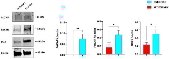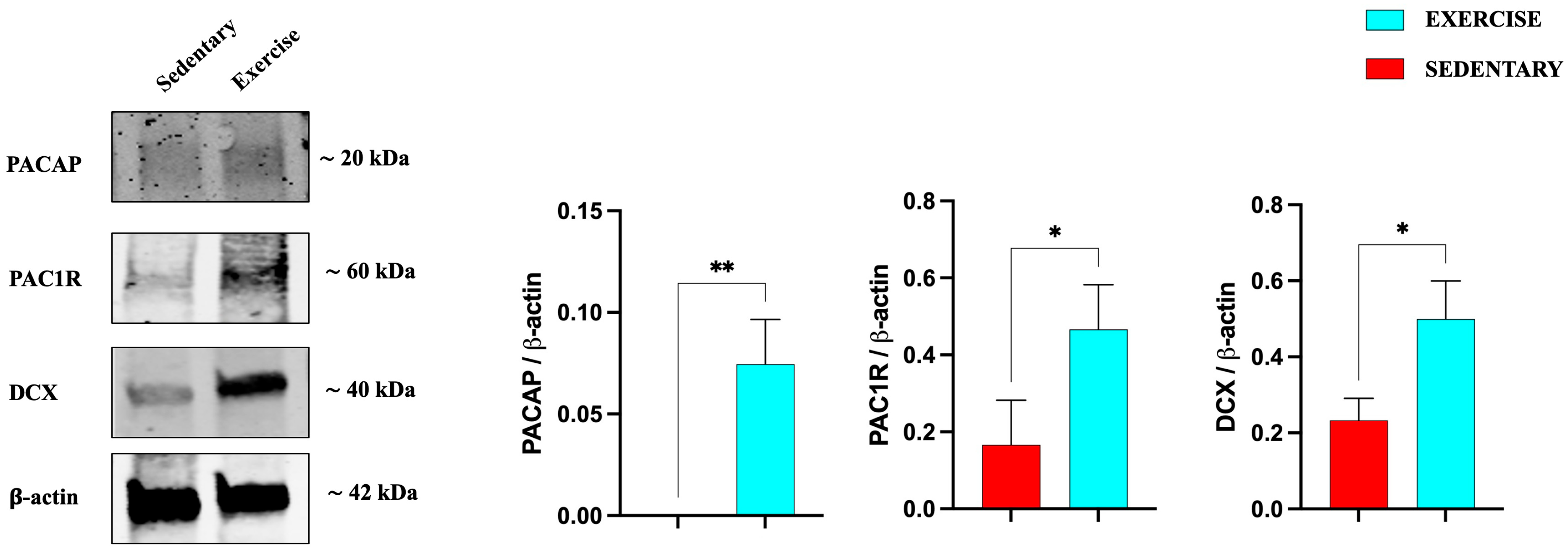 Figure 5. Representative immunoblots of PACAP, PAC1R, and DCX expression in hippocampus of sedentary (n = 12) and training (n = 12) rats. The bar graph shows quantitative analysis of signals obtained by immunoblots resulting from three independent experiments. Relative band densities were quantified using ImageJ software. Protein levels are expressed as arbitrary units obtained following normalization to β-actin, which was used as loading control. Data represent means ± SEM. * p < 0.05 and ** p < 0.01 vs. sedentary, as determined by unpaired two-tailed Student t-test.
