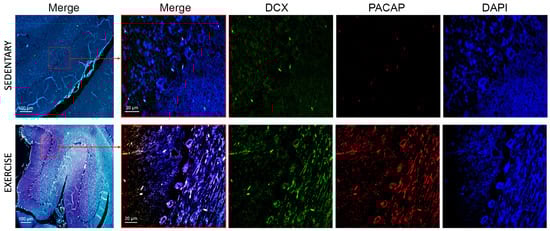 To assess the subcellular co-localization of PACAP and DCX, IF staining was performed. As depicted in Figure 7, in the DG of sedentary animals, PACAP and DCX exhibited low-level co-expression, primarily localized to the perinuclear compartment and cytoplasm. In animals subjected to moderate physical training, DCX immunoreactivity was markedly upregulated, corroborating data obtained from immunohistochemistry and Western blot analyses. Furthermore, certain cells demonstrated robust PACAP immunostaining that co-localized with DCX, suggesting potential functional interplay in neurogenic regions under exercise-induced conditions.