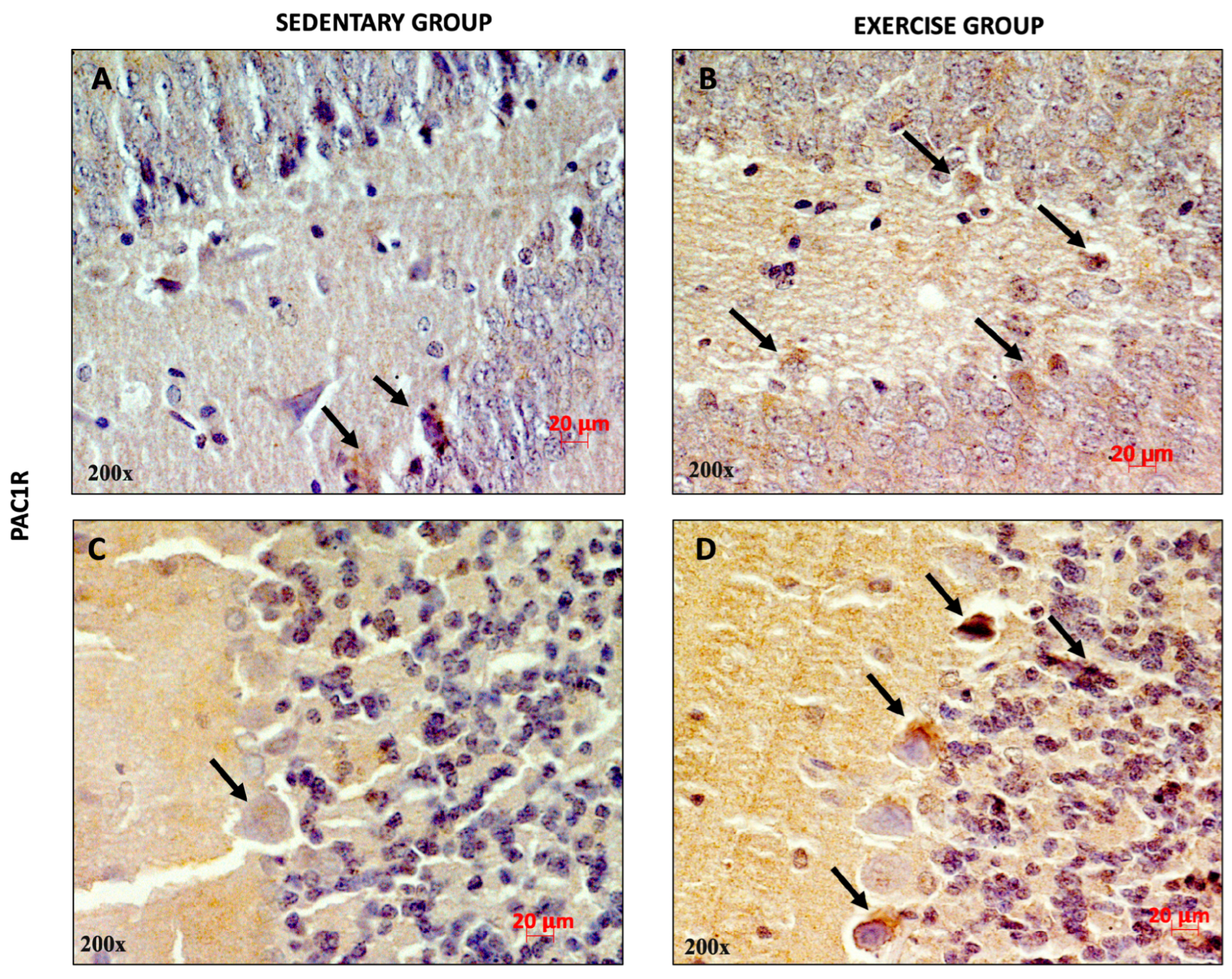 Figure 3. Representative immunohistochemical staining of PAC1R in DG (n = 12) (A,B) and cerebellum (n = 12) (C,D) of sedentary rats and rats performing moderate training. Digital micrographs are representative results of fields taken in randomly selected slides and obtained using the Zeiss Axioplan light microscope, fitted with a digital camera. The black arrows refer to the PAC1R immunopositive cells. Scale bar: 20 μm. Magnification: 200×.
