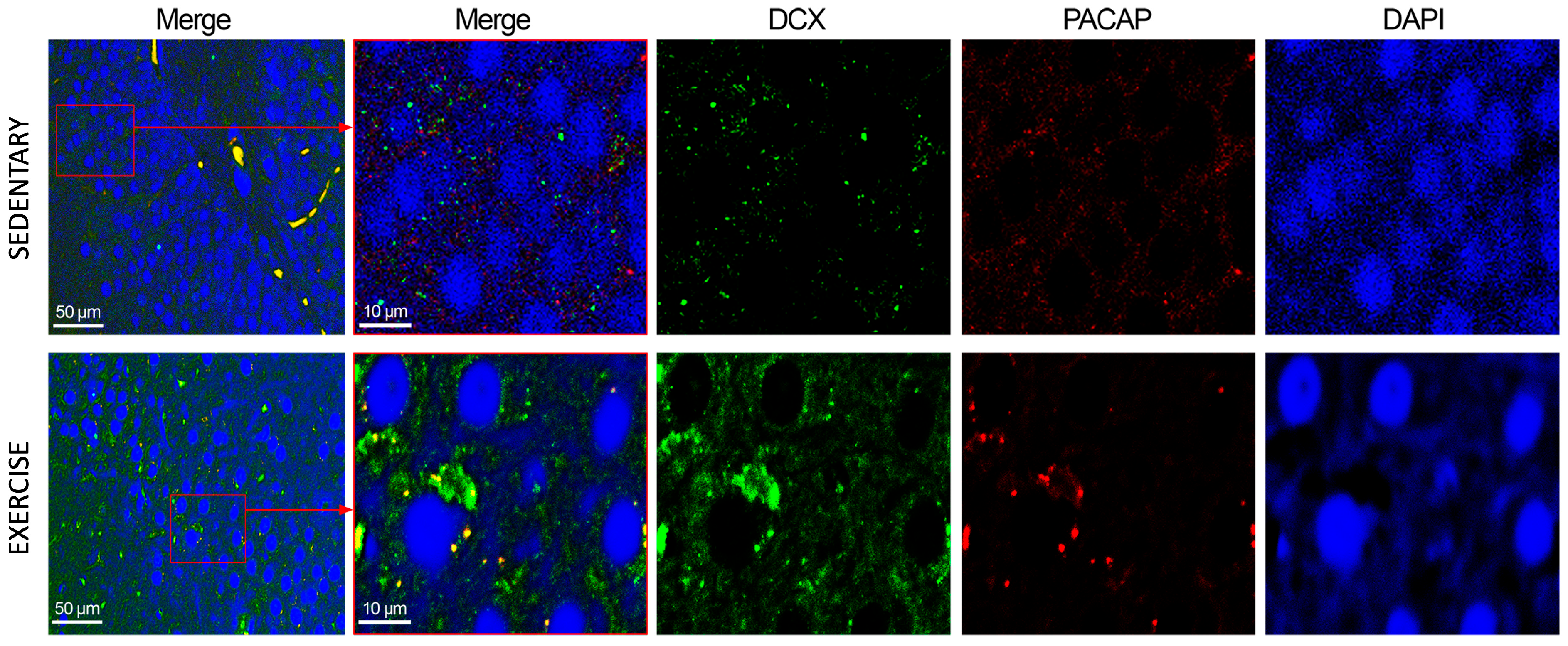 Figure 7. Co-localization of DCX and PACAP in DG of sedentary (n = 12) and training rats (n = 12). Representative photomicrographs show MERGE (yellow), DCX expression (green), PACAP (red), and DAPI (blue). Photomicrographs are representative results of fields taken randomly from each slide. Scale bar: 50 µm and 10 µm.