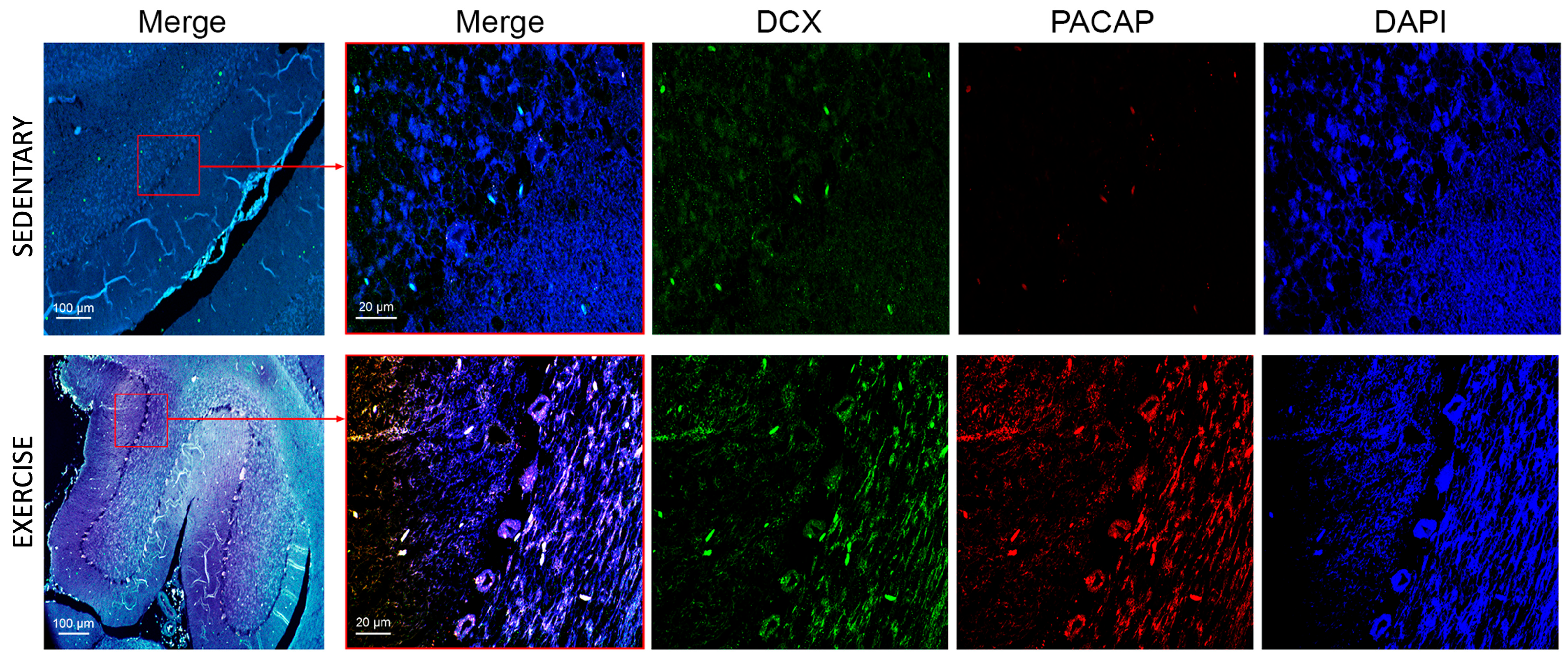 Despite these findings, several limitations should be considered. Firstly, our experiments were conducted exclusively in adult male rats. Future studies should include females to determine whether there are sex-dependent differences in the expression of this neurotrophic factor. In addition, it would be valuable to examine whether the absence of PACAP alters the effects of moderate physical activity on neurogenesis by comparing wild-type and PACAP-knockout rats. Such studies could also employ a broader panel of neurogenesis markers and include animals at different developmental stages to provide a more comprehensive understanding of PACAP’s role in exercise-induced neurogenesis. Moreover, we used only DCX as a marker for neurogenesis; therefore, future studies with mature neuronal markers like NeuN are needed. Furthermore, longitudinal behavioral assays or electrophysiological recordings will be essential to determine if this increase in immature neurons translates into functional integration and improved cognitive outcomes. In conclusion, moderate exercise is associated with upregulated PACAP/PAC1R and DCX expression in the DG and cerebellar cortex, suggesting a possible role in exercise-related neuroplasticity that requires further mechanistic validation.