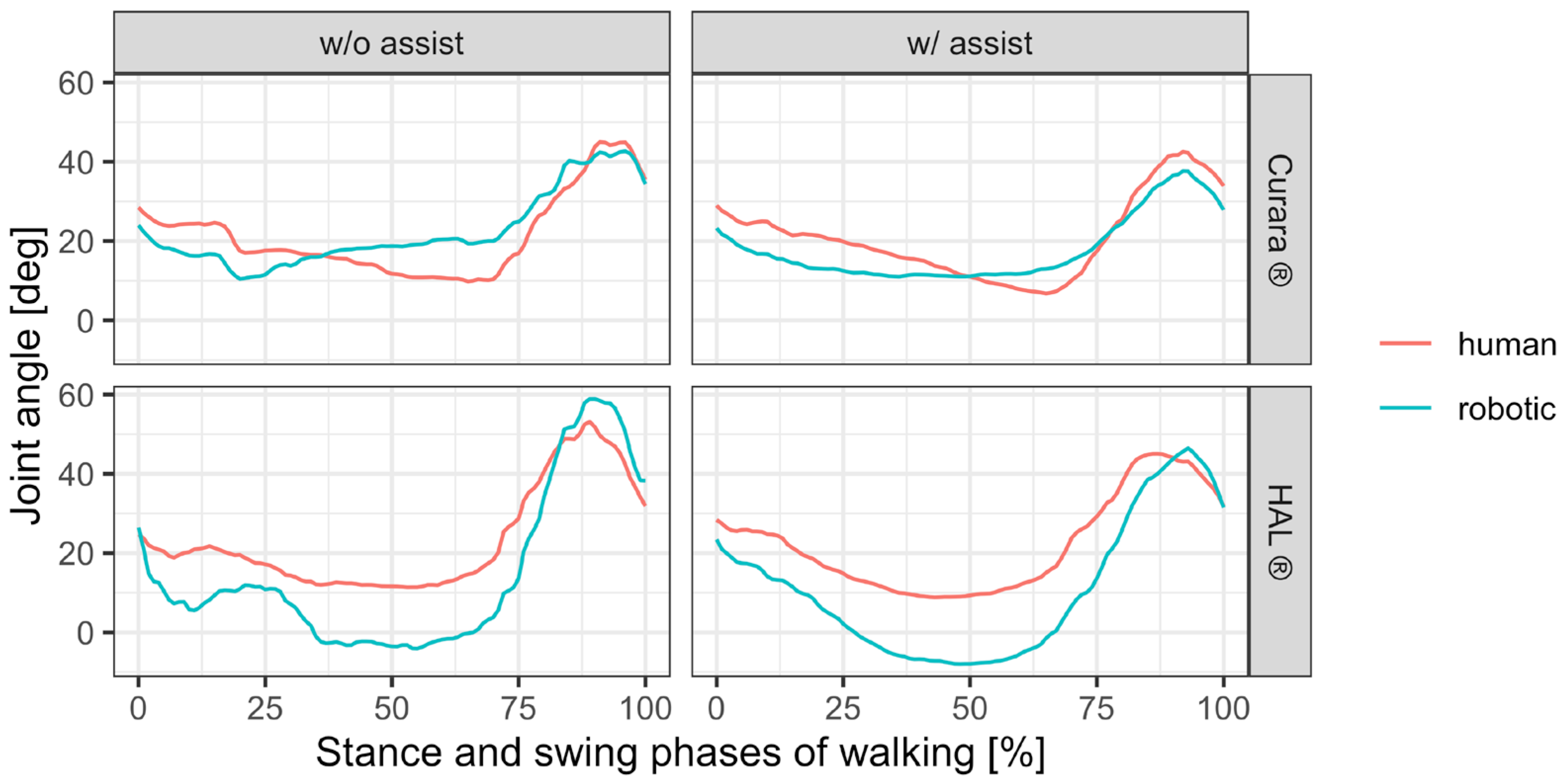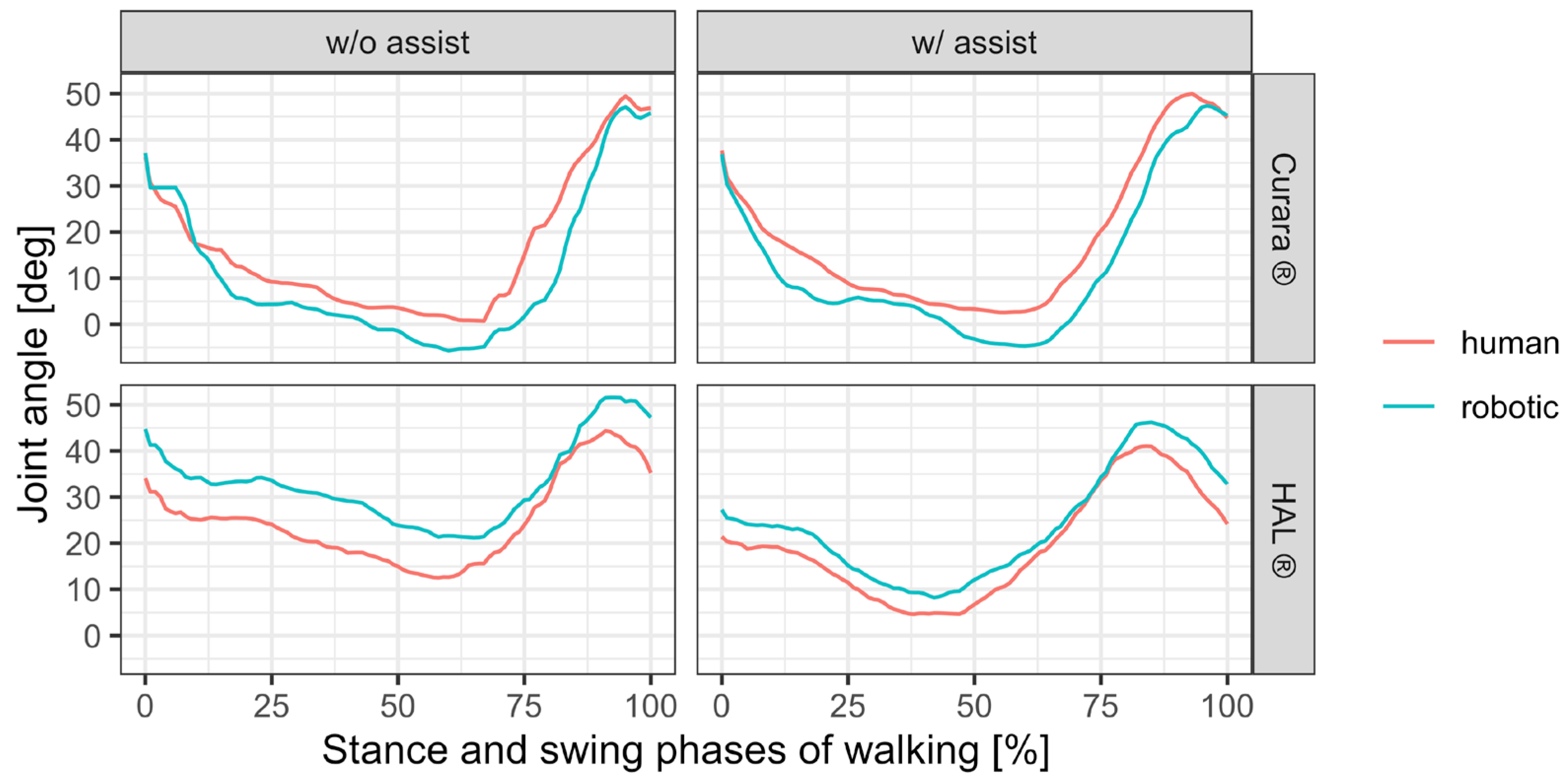 Background: Robotic assistive devices are increasingly used in post-stroke gait rehabilitation, yet quantitative evaluations of synchronization between human and robotic joint motion remain limited. This study examined gait kinematics in post-stroke hemiplegic patients using two exoskeleton-type devices—HAL® (Cyberdine Inc., Tsukuba, Japan) and curara® (AssistMotion Inc., Ueda, Japan)—based on synchronized IMU measurements. Methods: Two post-stroke patients performed treadmill walking under non-assisted and assisted conditions with HAL® and curara®. Only the paretic knee joint was analyzed to focus on the primary control joint during gait. Inertial measurement units (IMUs) simultaneously recorded human and robotic joint angles. Synchronization was assessed using Bland–Altman (BA) analysis, root mean square error (RMSE), and mean synchronization jerk (MSJ). The study was designed as an exploratory methodological case study to verify the feasibility of synchronized IMU-based human–robot joint measurement. Results: Both assistive devices improved paretic knee motion during gait. RMSE decreased from 7.8° to 4.6° in patient A and from 8.1° to 5.0° in patient B. MSJ was lower during curara-assisted gait than HAL-assisted gait, indicating smoother temporal coordination. BA plots revealed reduced bias and narrower limits of agreement in assisted conditions, particularly for curara®. Differences between HAL® and curara® reflected their distinct control strategies—voluntary EMG-based assist vs. cooperative gait-synchronization—rather than superiority of one device. Conclusions: Both devices enhanced synchronization and smoothness of paretic knee motion. curara® demonstrated particularly smooth torque control and consistent alignment with human movement. IMU-based analysis proved effective for quantifying human–robot synchronization and offers a practical framework for optimizing robotic gait rehabilitation. The novelty of this study lies in the direct IMU-based comparison of human and robotic knee joint motion under two contrasting assistive control strategies.