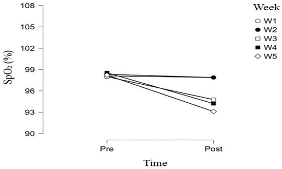 Changes in heart rate were complemented by alterations in peripheral oxygen saturation (SpO2), as illustrated in Figure 2. Pre-test SpO2 values remained stable and high (≈98%) across all five weeks, with minimal variability. In contrast, post-test SpO2 values showed a progressive decline throughout the intervention, particularly from the third week onward.