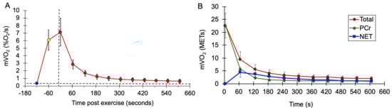Skeletal muscle makes up as much as 40% of the mass of the human body. The energy demands of skeletal muscle at rest, during exercise, and after exercise make important contributions to health. Post-exercise oxygen consumption (EPOC) is a well-studied and important component of the body’s response to exercise [1,2,3,4,5,6]. Typically, EPOC is measured as changes in whole-body oxidative metabolism after physical activity, although recent studies have started to evaluate EPOC in specific muscles (mEPOC) [7,8]. These studies have reported that mEPOC can be as high as fourfold resting metabolism 15 min after exercise has stopped [7,8]. A major metabolic contributor to EPOC is the resynthesis of phosphocreatine (PCr) [2], which is typically completed in 1–3 min [9]. However, other factors such as increased muscle temperature, increased lactate metabolism, return of calcium to the sarcoplasmic reticulum, glycogen resynthesis, and activation of genetic pathways can contribute to the longer-lasting EPOC [2].