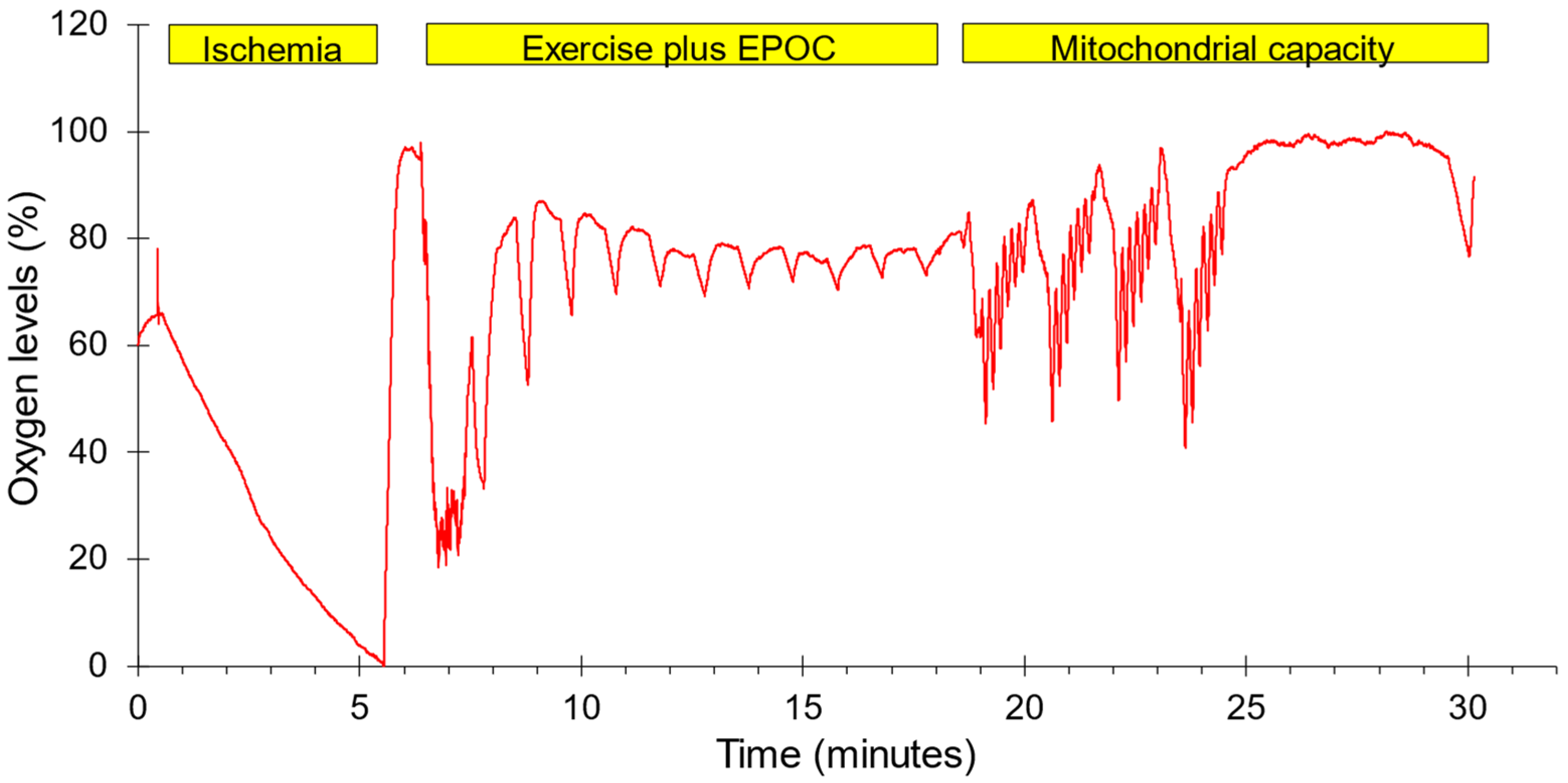 - Sumner, M.D.; Beard, S.; Pryor, E.K.; Das, I.; McCully, K.K. Near Infrared Spectroscopy Measurements of Mitochondrial Capacity Using Partial Recovery Curves. Front. Physiol. 2020, 11, 111. [Google Scholar] [CrossRef]