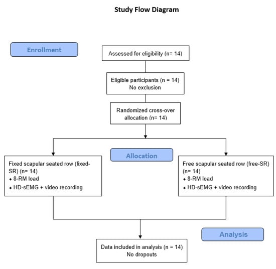 The study employed a randomized cross-over protocol with a repeated-measures, within-participant structure, consistent with earlier works in this area [15,20,28,49]. Each participant attended three laboratory visits. During the initial visit, individuals were introduced to both the fixed scapular position (fixed-SR) and free scapular position seated-row (free-SR) techniques and the optimal placement of the electrode grids for each muscle was determined. The second visit involved assessing the 8-repetition maximum (8-RM) for the two SR conditions, with the testing order counterbalanced across participants [20,28]. The final visit began with the collection of maximal voluntary isometric contractions for all muscles, followed by a minimum of 10 min of passive rest. Thereafter, surface electromyography (sEMG) signals were recorded while participants performed a controlled set of each SR variation using their respective 8-RM load, completing four repetitions. The limited number of repetitions and the rest intervals provided were intended to minimize the influence of neuromuscular fatigue on the recorded signals. An 8-RM load was selected to reflect a commonly adopted intensity in resistance training practice while ensuring sufficient mechanical demand to elicit clear neuromuscular responses [56]. Although submaximal loads (e.g., 60–70% of one-repetition maximum) are frequently used in electromyographic studies to minimize fatigue, higher relative loads have also been shown to provide reliable sEMG measurements when the number of repetitions is limited and adequate recovery is provided [6,57]. In the present study, only four repetitions were performed per condition, well below the maximal repetition capacity associated with the 8-RM load, and a minimum rest period of 3 min was allowed between conditions. This approach was adopted to minimize the accumulation of neuromuscular fatigue and to focus the analysis on steady-state repetitions rather than on fatigue-induced alterations in muscle excitation. A minimum recovery interval of 72 h was imposed between experimental sessions. During the study period, participants were instructed to refrain from engaging in any other resistance training activities.