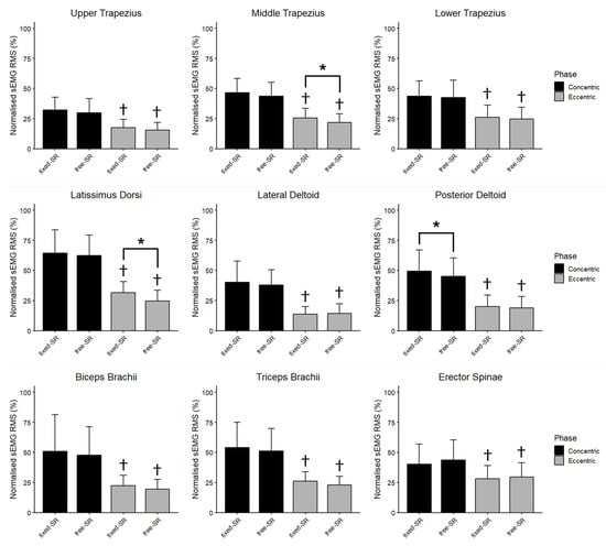 The mean (SD) of the normalized root mean square (nRMS) recorded during the concentric and the eccentric phase of fixed scapular position seated row (fixed-SR) and free scapular position seated row (free-SR) is shown for each muscle. Besides fixed vs. free seated row differences, nRMS was greater during the concentric than the eccentric phase for all muscles. *: p < 0.05 vs. free-SR. †: p < 0.05 vs. eccentric phase.