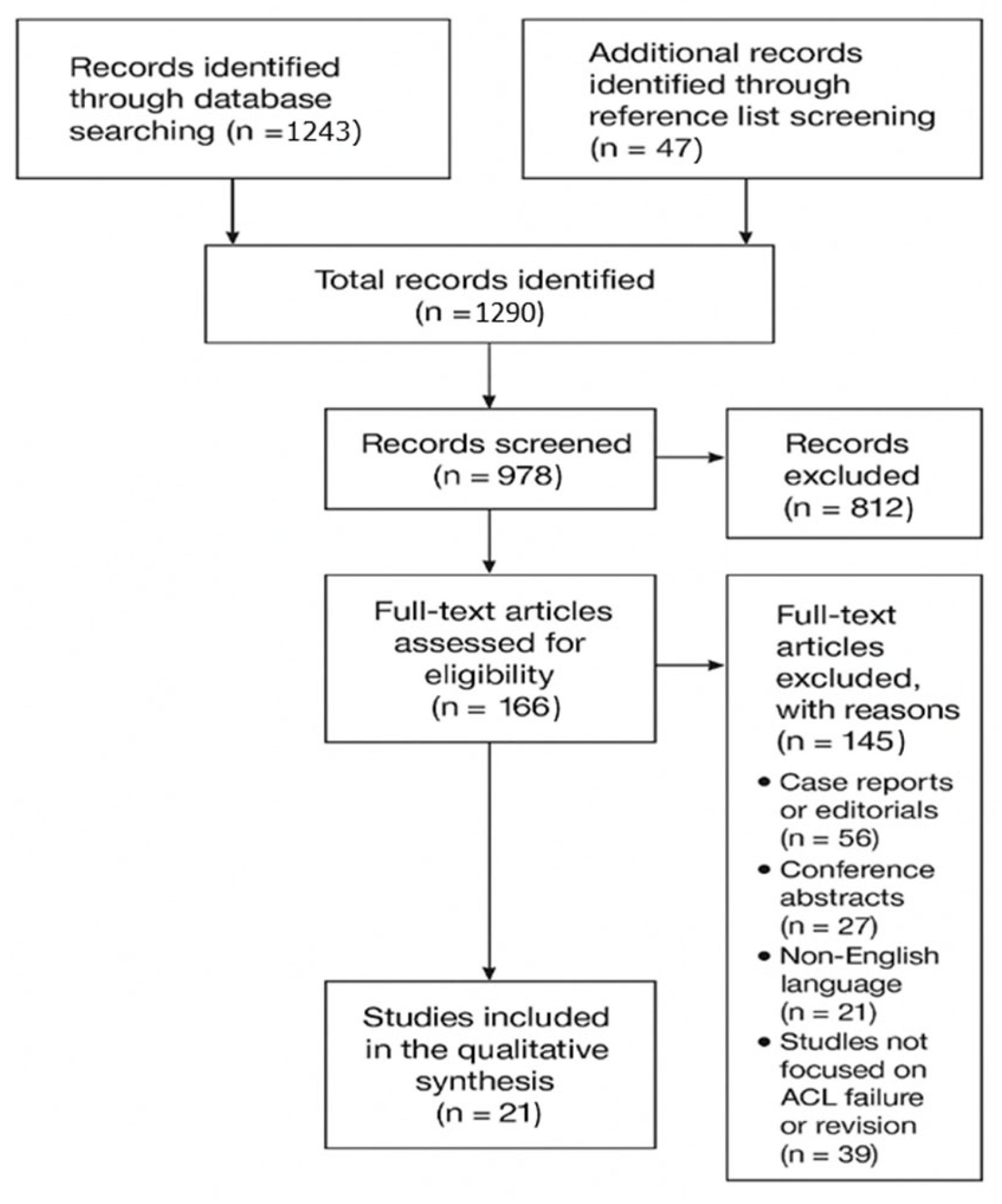 The final synthesis integrated evidence-based data, expert consensus, and clinical experience to provide a comprehensive overview of current knowledge in the field of ACL reconstruction failure and revision surgery. The process of study selection is summarized in the PRISMA flow diagram (