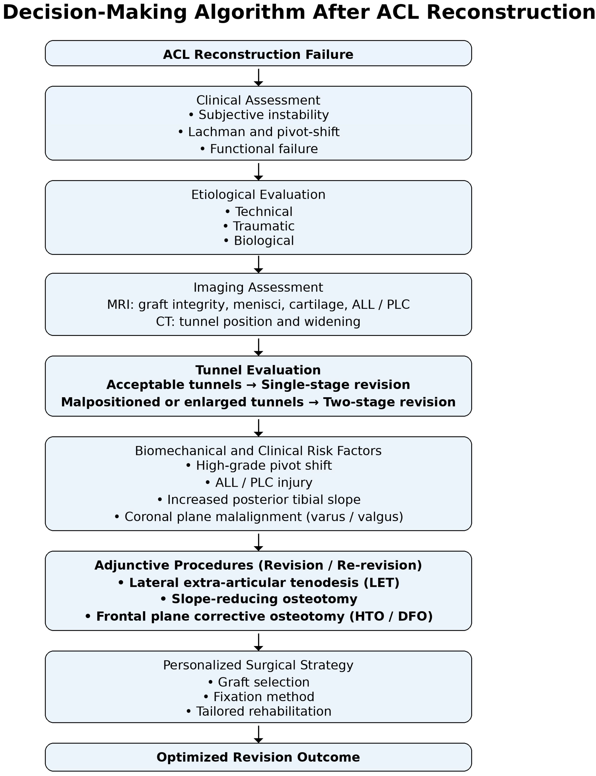 ACL reconstruction failure is a multifactorial event that requires comprehensive assessment and individualized surgical planning. Successful revision surgery depends on technical precision in tunnel placement, appropriate graft selection, and thorough management of associated lesions, including meniscal, anterolateral, and posterolateral structures.