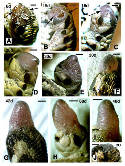 Macroscopic view showing the aspect of regenerating hind-limbs at progressive days (d) post-amputation. (A–C,G,H) FGF1-treatment. (D–F,I) FGF2 treatments. Bars in all figures represent 1 mm. (A–E) and (G–H) show regenerating limbs after leg (mid tibia-fibula) amputation; (F,I) are regenerating limbs after thigh (mid femur) amputation; (A) at 6 days post-amputation the stump surface is covered by a scab (arrows); (B) at 15 days regenerating case with wound epidermis and underlined mesenchyme (arrows) sealing almost completely the stump surface; (C), in this case at 16 days a blastema (arrow) is fully formed; (D–I), gross aspect of elongating conical blastemas in representative cases at different days post-amputation; (H) the longest case at 60 days post-amputation features some flattening; (J) control of amputated limb at 25 days post-amputation.