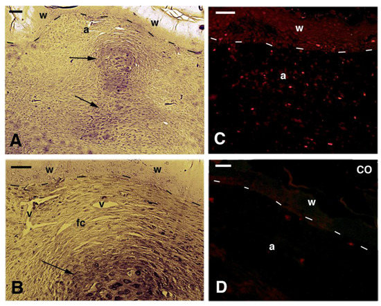 Histological images of scarring controls at 40 days (A,B) with 5BrdU immunolabeling (C,D). (A) longitudinal section of a scarring limb that is occupied by an irregular fibrous connective tissue with some cartilaginous nodules (arrows) in the center. The wound epithelium presents un-stainable areas in the stratum corneum. Bar, 50 μm; (B) detail of the apical region of the scarring outgrowth showing the cells forming the fibrous connective tissue where sparse blood vessels are present under the apical wound epidermis. The arrow indicates the apical cartilage. Bar, 20 μm; (C) 5brdU immunolabeling showing few and sparse labeled cells in the apical connective tissue present underneath the wound epidermis. Bar, 20 μm; (D) control section of the apical connective tissue present beneath the wound epidermis. Bar, 10mm Legends: a, apical connective tissue (blastema); CO, control section; fc, fibrous connective tissue; v, blood vessel; w, wound epidermis. Dashes underline the epidermis.