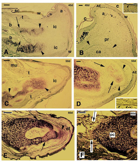 C) lateral region of the outgrowth (its indicative position is shown by an arrow in the inset drawing; the arrowhead points to the bone marrow of the tibia). Numerous labeled cells are seen in the epidermis (outlined by dashes), dermis and among repairing muscles are seen. The arrows indicate the perichondrium surrounding the central cartilaginous rod. Bar, 50 μm; (