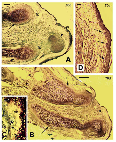 Longitudinal sections of regenerating limbs treated with FGF1 at 60 days (A–C) and 70 days (D) post-amputation. (A) distal region of an outgrowth containing two separated cartilaginous elements (arrows), the upper considered a regenerated tibia, and the lower a regenerated fibula. A dense fibrous connective tissue (fc) surrounds the cartilage, forming the perichondrium. In front of them a cartilaginous nodule (arrowhead) is seen. The apical wound epithelium (w) shows numerous epidermal papillae (small pegs). Bar, 200 μm; (B) separated regenerated cartilages of the tibia (upper arrow) and fibula (lower arrow), surrounded by a thick perichondrium (arrows) in the long outgrowth illustrated in Fig 1H, examined at 70 days post-amputation. The tibia cartilage is attached to the original tibia bone (b). Bar, 50 μm; (C) detail of calcified cartilage (cc) localized near the perichondrium (arrow) of the cartilaginous tibia. Bar, 20 μm; (D) detail of apical wound epidermis of the outgrowth of figure B, featuring the numerous epidermal papillae (arrows). Bar, 200 μm.