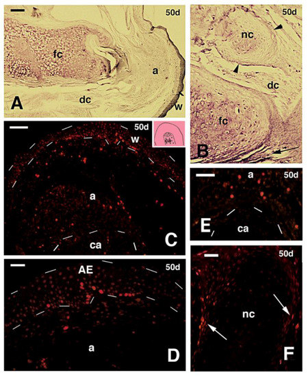 Histological (A,B) and 5BrdU-immunofluorescent (C–F) images of a regenerating outgrowth at 50 days after mid femur transection (FGF2 treatment). (A) Distal part of regenerated femur cartilage surrounded by a fibrous and dense connective tissue. Bar, 100 μm; (B) detail of an apical cartilaginous nodule surrounded by perichondrium (arrowheads), located near the tip of the femur cartilage. Bar 20 μm; (C) labeled cells (red dots) are distributed in the apical region of the outgrowth (see location in the pink inset drawing featuring a limb blastema with the central cartilaginous rod, dotted, derived from the transected femur). The wound epidermis and the tip of the regenerated cartilage are indicated by dashes. Bar, 50 μm; (D) detail of the apex of the outgrowth with most labeled cells in the apical wound epidermis outlined by dashes. Bar, 20 μm; (E) detail of labeled cells within the apical region (blastema), that are present near the tip of the regenerated cartilaginous rod (dashed). Bar, 20 μm; (F) detail of a cartilage nodule present at the tip of the regenerated outgrowth, and surrounded by labeled cells of the perichondrium (arrows). Bar, 20 μm. Legends: a, apical region (blastema); AE, apical wound epidermis; ca, regenerated cartilaginous rod of the transected femur; dc, dense connective tissue; fc, femur cartilage. nc, nodule cartilaginous; w, wound epidermis.