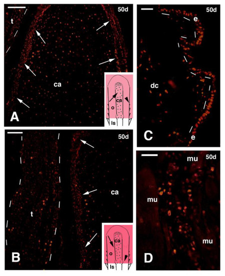 Immunofluorescence for 5BrdU of different regions of 50 days old outgrowths, obtained after mid femur transection and FGF2 treatment. (A) Distribution of labeled cells in the cartilage rod (in the inset, the indicative position is shown with an arrow pointing the regenerated cartilage rod formed within the outgrowth; the arrowhead refers to regenerating scales). The arrows indicate the perichondrium. Bar, 50 μm; (B) detail of the region localized between the cartilage rod and the close tendon-like belt (the inset drawing shows the indicative position with an arrow pointing near the regenerated cartilage rod; the arrowhead refers to the proximal repairing muscles). The arrows indicate the perichondrium while the dashes outline the dense tendon-like belt. Bar, 50 μm; (C) regenerating scales (their indicative position is shown by the arrowhead seen in the inset in (A). Bar, 20 μm; (D) detail of repairing muscles located at the base of the outgrowth (their indicative position is shown by the arrowhead in the inset in (B). Bar, 20 μm. Legends: ca, regenerated cartilage; dc, dense connective tissue of the dermis; e, regenerating scale epidermis; ls, limb stump; mu, regenerating muscles; o, limb outgrowth; t, tendon-like belt.