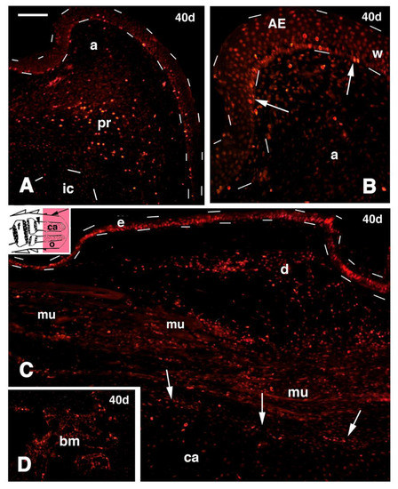 D) detail on labeled cells within the bone marrow (its position is indicated by an arrowhead in the inset of figure C. Bar, 20 μm. Legends: a, apical connective tissue (blastema); AE, apical wound epidermis; bm, bone marrow; ca, regenerated cartilaginous rod; d, dermis; e, epidermis; f, femur (stump); ic, immature apical cartilage; mu, regenerating muscles; o, outgrowth; pr, apical perichondrium; w, wound epidermis.