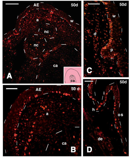 Immunofluorescence for 5BrdU in different regions of 50 days old outgrowths (tibia-fibula transection and FGF2 treatment). (A) Apical region of the outgrowth, showing intense labeling in the apical epidermis (outlined by dashes), apical connective tissue, and in the cartilaginous nodules (outlined by dashes). Little labeling is observed in the cartilaginous rod, outlined by dashes in the lower part of the figure (indicative position shown in the drawing inset). Bar, 50 μm; (B) detail of the apical region of the outgrowth, showing the numerous labeled cells present in the wound epidermis and underlying connective tissue (dashes outline the tip of the cartilaginous rod). Bar 20 μm; (C) epidermal peg (outlined by dashes) containing numerous labeled cells at the beginning of scale regeneration. Bar, 20 μm; (D) regenerated scale with numerous labeled cells localized in the stratum basale. Bar, 20 μm. Legends: a, apical connective tissue (blastema); AE, apical wound epidermis; ca, regenerated cartilage (rod); d, dermis; h, hinge region; I, inner scale surface; nc, nodulus cartilaginous; os, outer scale surface (dorsal); p, epidermal peg (beginning of scale formation); w, wound epidermis (regenerating).