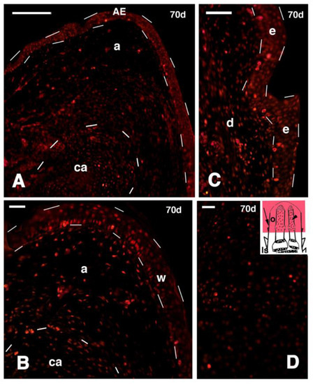 Immunofluorescence for 5BrdU of different regions of 70 days old outgrowths after tibia-fibula transection (FGF1 treatment). (A) Diffusely distributed labeled cells in the apical region of the outgrowth. The regenerating epidermis is outlined by dashes. Below, the tip of the regenerated cartilaginous rod is also outlined by dashes. Bar, 50 μm; (B) detail of the tip of the outgrowth containing sparse labeled cells, especially in the wound epidermis (outlined by dashes). The dashed line below indicates the cartilaginous rod. Bar 20 μm; (C) detail on regenerating scale epidermis (outlined by dashes) containing various labeled cells (their indicative position is shown by the arrow in the inset of figure D). Bar, 20 μm; (D) detail of the scarce labeled cells present in the cartilage rod of a the regenerated fibula (indicative position shown by the arrowhead in the inset). Bar, 20 μm. Legends: a, apical connective tissue; AE, apical wound epidermis; ca, regenerated cartilage; d, dermis; e, epidermis of the forming scale; ls, stump of the limb; o, limb outgrowth; w, wound epidermis.