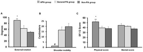 Finally, significant results obtained by comparing the evaluation data at the two-year follow up between the three study groups are displayed in Figure 1. In particular, significant differences were found for surgical shoulder external rotation and mobility. Indeed, in the APA group, the scores were significantly better than in the group practicing general physical activity and in the inactive (non–physical activity) group. In addition, SF-12 analysis revealed that physical and mental mean scores were higher in APA participants than in the general physical activity and non–physical activity groups.