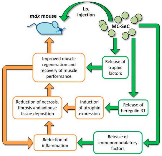 Although an antiinflammatory effect exerted by SeC was to be expected based on the peculiarities of this cell type, an additional and unexpected induction of utrophin expression in muscle tissue after i.p. injection of MC-SeC was found. The expression of utrophin was induced by SeC-released porcine heregulin β1, which from the peritoneal cavity was able to reach each muscle through the circulation [114]. The mechanism of action and the effects of i.p. injection of MC-SeC in mdx mice are summarized in Table 3.
