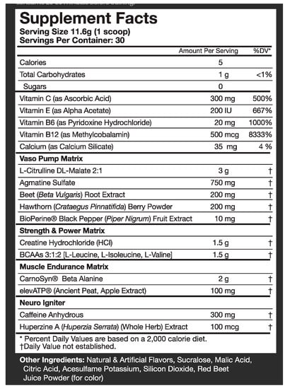 Assault Black Supplement Nutritional Information.