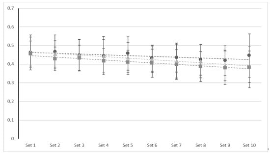 Graph for the best rep of mean velocity performance (m/s) in the bench press across each of the ten sets with lines for each different treatment. • = PLA trial, ▪ = SUP trial, ▲ = CAF.