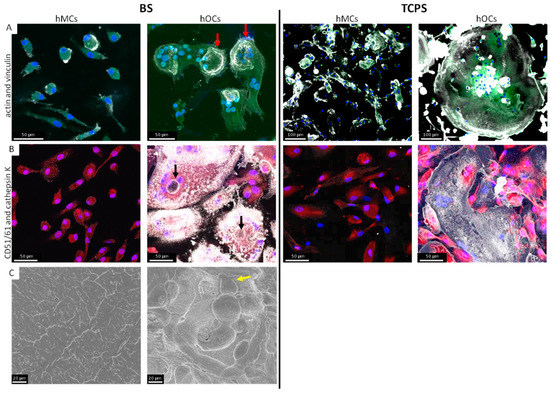 Comparison of hMCs and hOCs on BS and TCPS. The staining was performed after 14 days of cell culture with OC and basic medium, respectively. On both materials osteoclast-like large multinucleated cells occurred. The typical actin rings (red arrow) were only formed on BS (actin: white; vinculin: green) and by cells cultured with OC medium (A). The CD51/61 expression was shown on both materials (CD51/61: white; cathepsin K: red) but sealing zones were only formed on BS (black arrow) (B). Cells on BS were removed and resorption pits were visible in SEM-analysis (C) for hMCs in OC medium (yellow arrow).