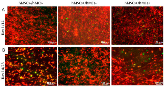 The Vybrant™ cell labeling was applied to obtain an overview of the distribution of hMCs and hMSCs on BS after 1 and 14 days of co-culture (Figure 2). Red stained hMSCs and green stained hMCs were detected in all three co-culture models directly after seeding (Figure 2A) or after 14 days (Figure 2B), whereby more hMSCs than hMCs were seen in all co-culture models.
