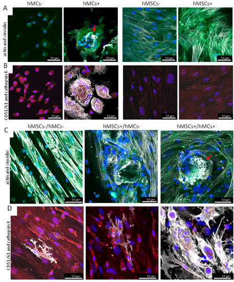 To evaluate the morphology of the different cell-types during the co-cultures, f-actin and vinculin, as well as CD51/61 and cathepsin K, were stained after 28 days of culture/14 days of co-culture (Figure 3). In the mono cell-culture controls, the typical actin morphology for osteoclasts (Figure 3A) and CD51/61 expression (Figure 3B) was only found for hMC+.