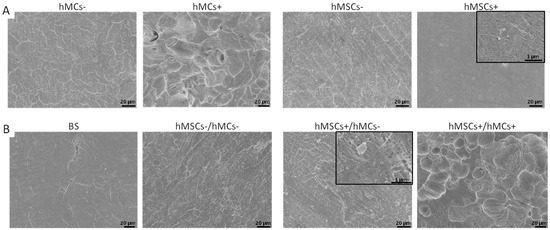 To evaluate the resorption activity of osteoclasts, bone slices were analyzed concerning resorption pits, also known as howship’s lacunae, after 14 days of co-culture. Therefore, the cells were detached, the BS were fixed, and SEM analysis was performed (Figure 4). Large Howship’s lacunae, caused by active osteoclasts, were detected on BS cultured with hMCs+ (Figure 4A).