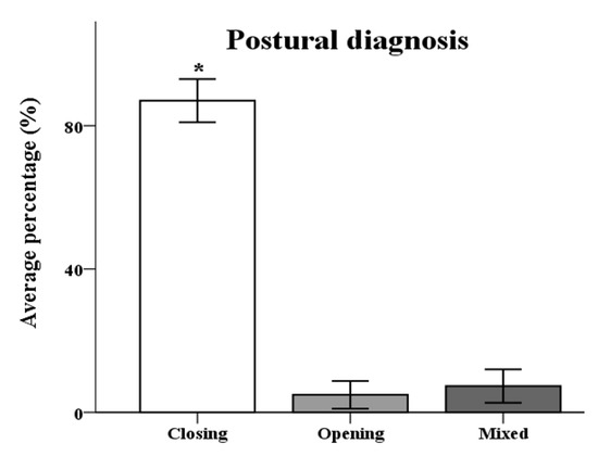 Postural diagnosis of the different morphotypologies. Mean postural diagnosis in the morphologies at closing (n = 107), opening (n = 6), and mixed (n = 9). The closing diagnosis presented a statistically significant difference in relation to the other morphotypologies (* p < 0.0001).