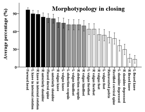 Figure 2 represents the mean percentage of the postural variables evaluated within the morphotypology in closing (n = 107). Bars filled in the scale from black to light gray show the variables with a percentage above 50% change. Note, that the highest percentage values (above 50%) were observed in the following variables: head anteriorized (96%); flexion dorsal (78%); anterior shoulders (>80%); abducted scapula (67%); and right and left foot valgus (54%, Figure 2).